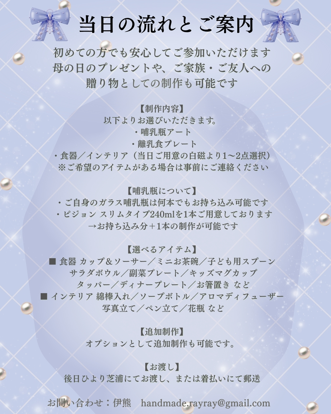 本ワークショップでは、離乳食用食器や哺乳瓶にお好きなデザインを施し、オリジナル作品を制作いただけます。初めての方でもご参加可能です。