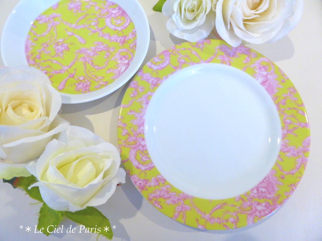 この春の「限定カタログ」で新発売となった「トワルドジュイ ブランコの少女」の限定カラー転写紙で...♪ 色鮮やかなピンク×イエローグリーンが白磁の白に映える、春の気分にもピッタリな美しい作品です。