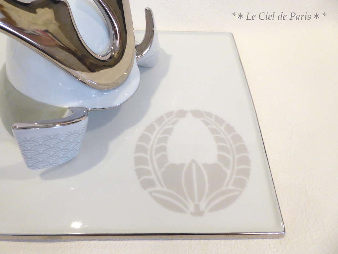 代々受け継ぐ事が出来る見事なカッターワークの家紋入り台座に、吹返はグレーの青海波、鍬形はプラチナに輝く兜が凛と佇む美しい作品です。