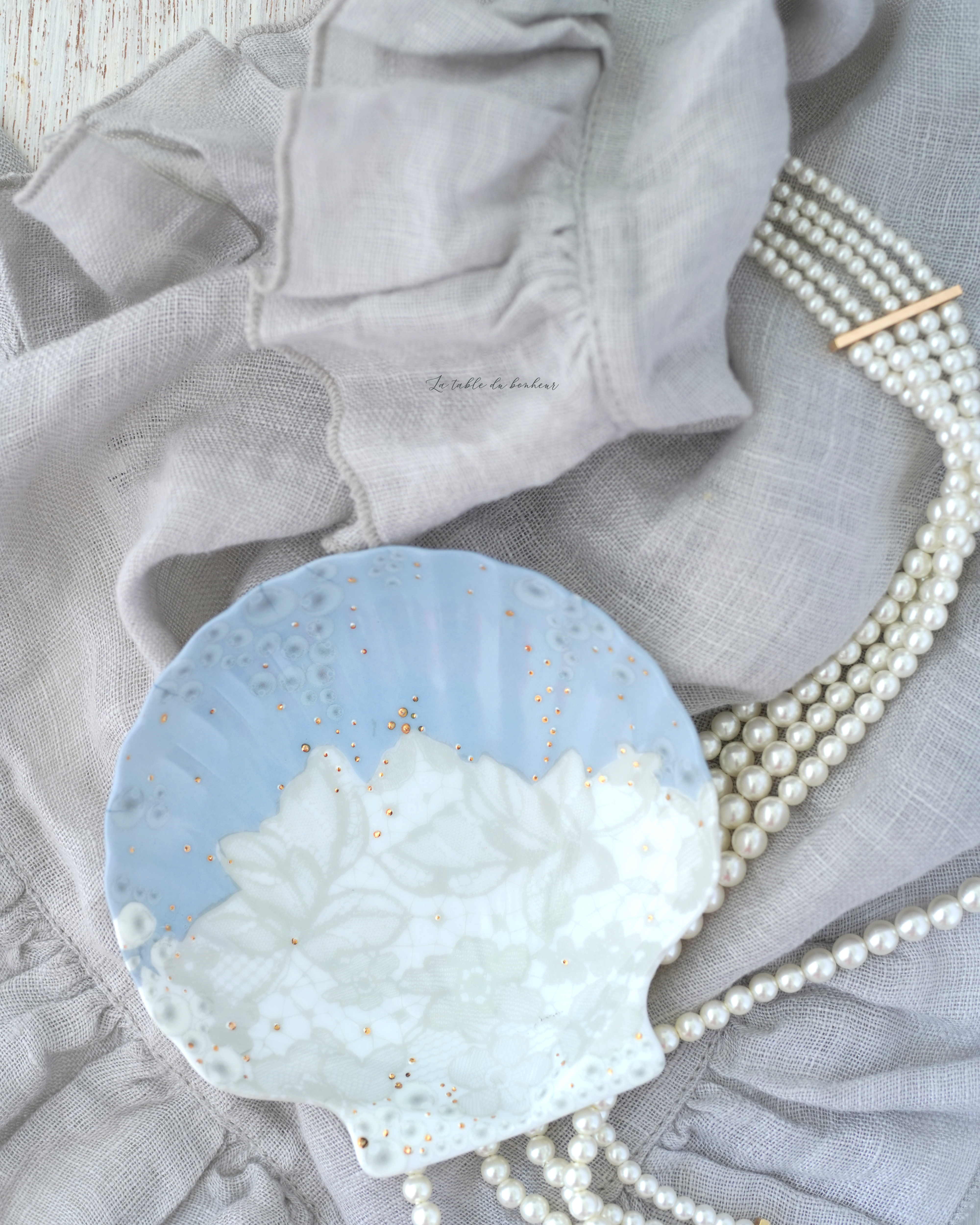 2025年7月のマンスリーアイテム「シェルプレート」のサンプル制作を担当させていただきました。「大人な女性が日常で使う特別な一枚」をテーマにしてみました。 シェルが引き立つような、大人なブルーをベースに、煌めくパールを散りばめ、金彩で繊細な輝きをプラス。そして上品なレース模様でエレガントさを添えました。