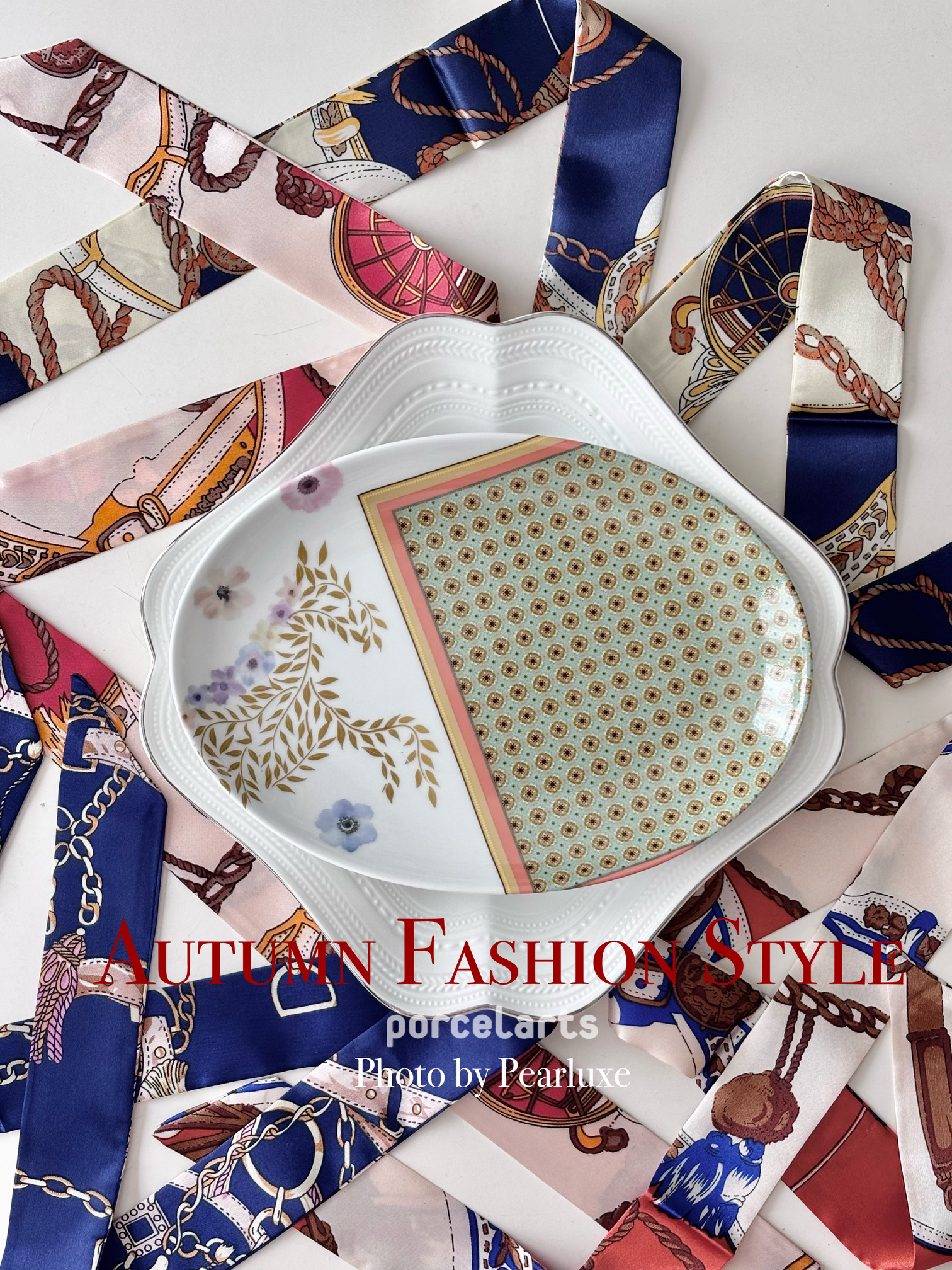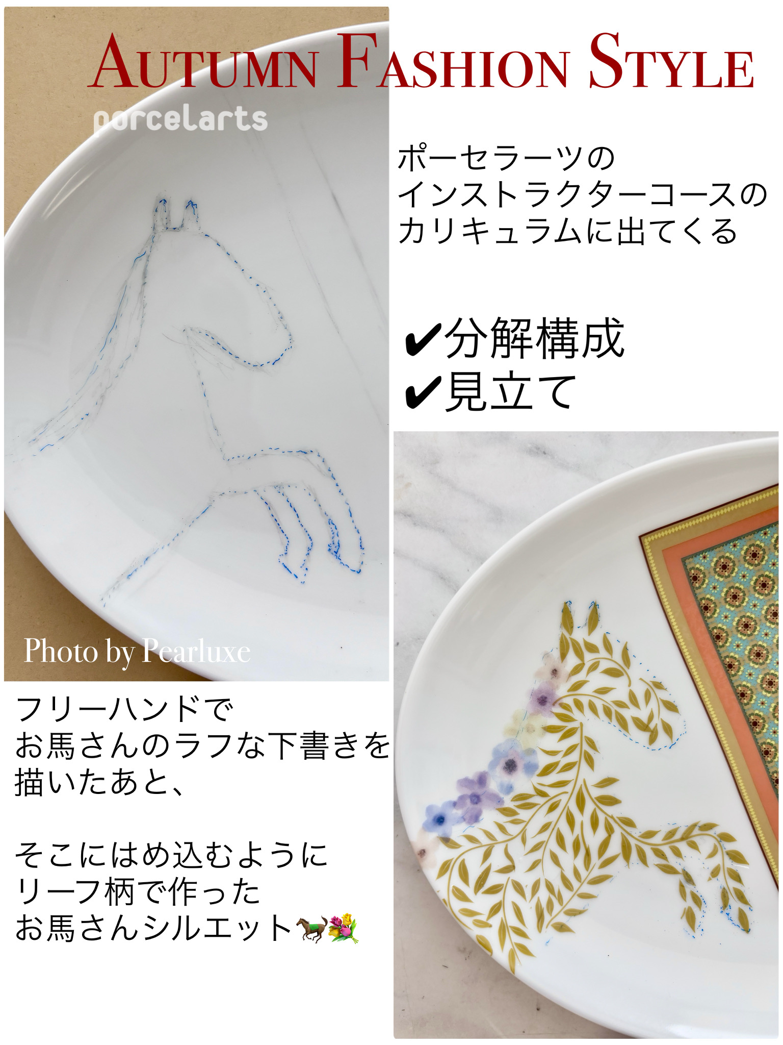 ポーセラーツのインストラクター資格取得コースのカリキュラム内でも出てくる学び『分解構成』『見立て』を活かすべく、フリーハンドでお馬さんのラフな下書きを描いたあと、そこにはめ込むようにリーフ柄でお馬さんシルエット。