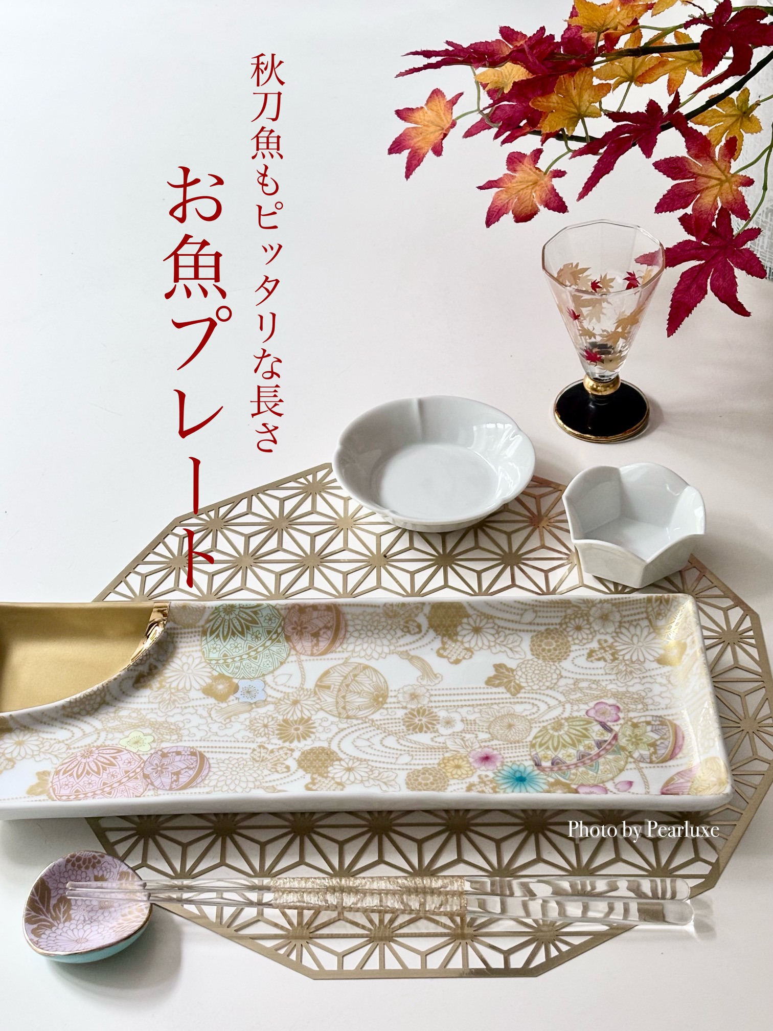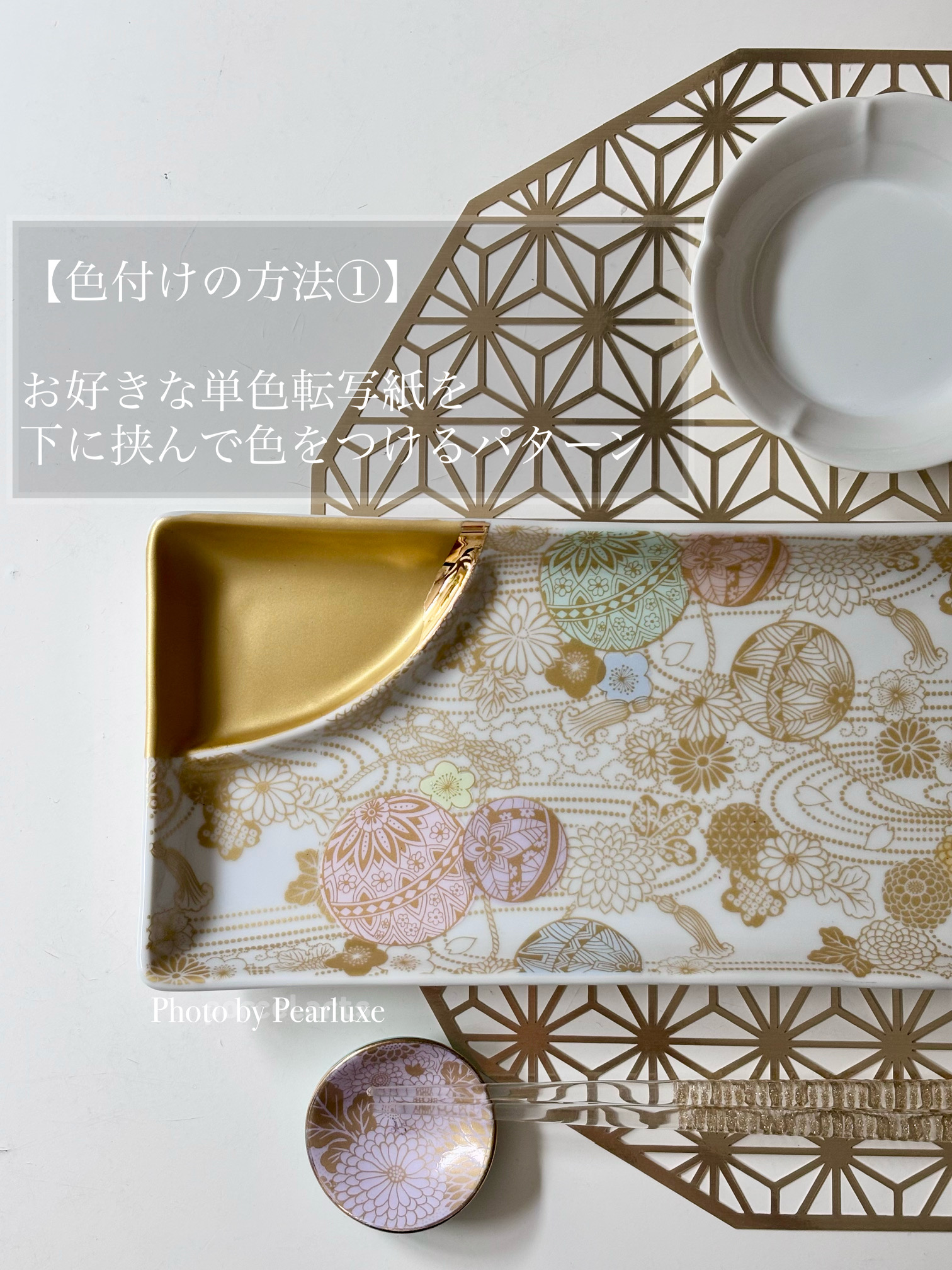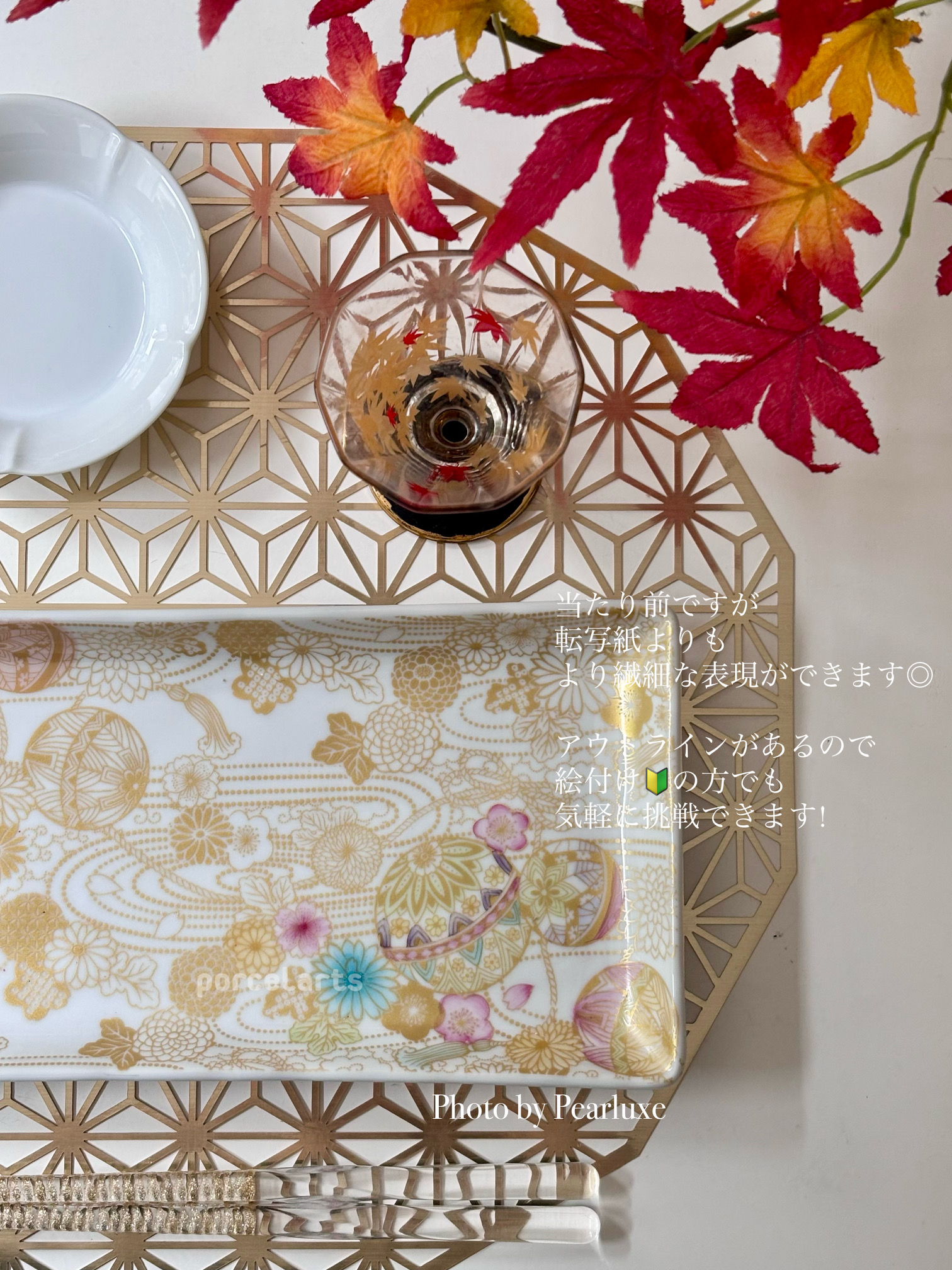 メタリックゴールドのアウトラインだけでも美しい転写紙ですが、単色転写紙や上絵の具で色をつけてあげても可愛さ倍増。 秋刀魚もピッタリのせられるサイズ!!便利なお魚プレートです♡