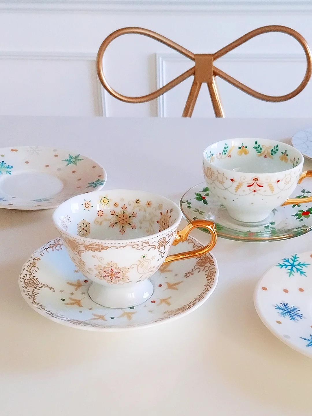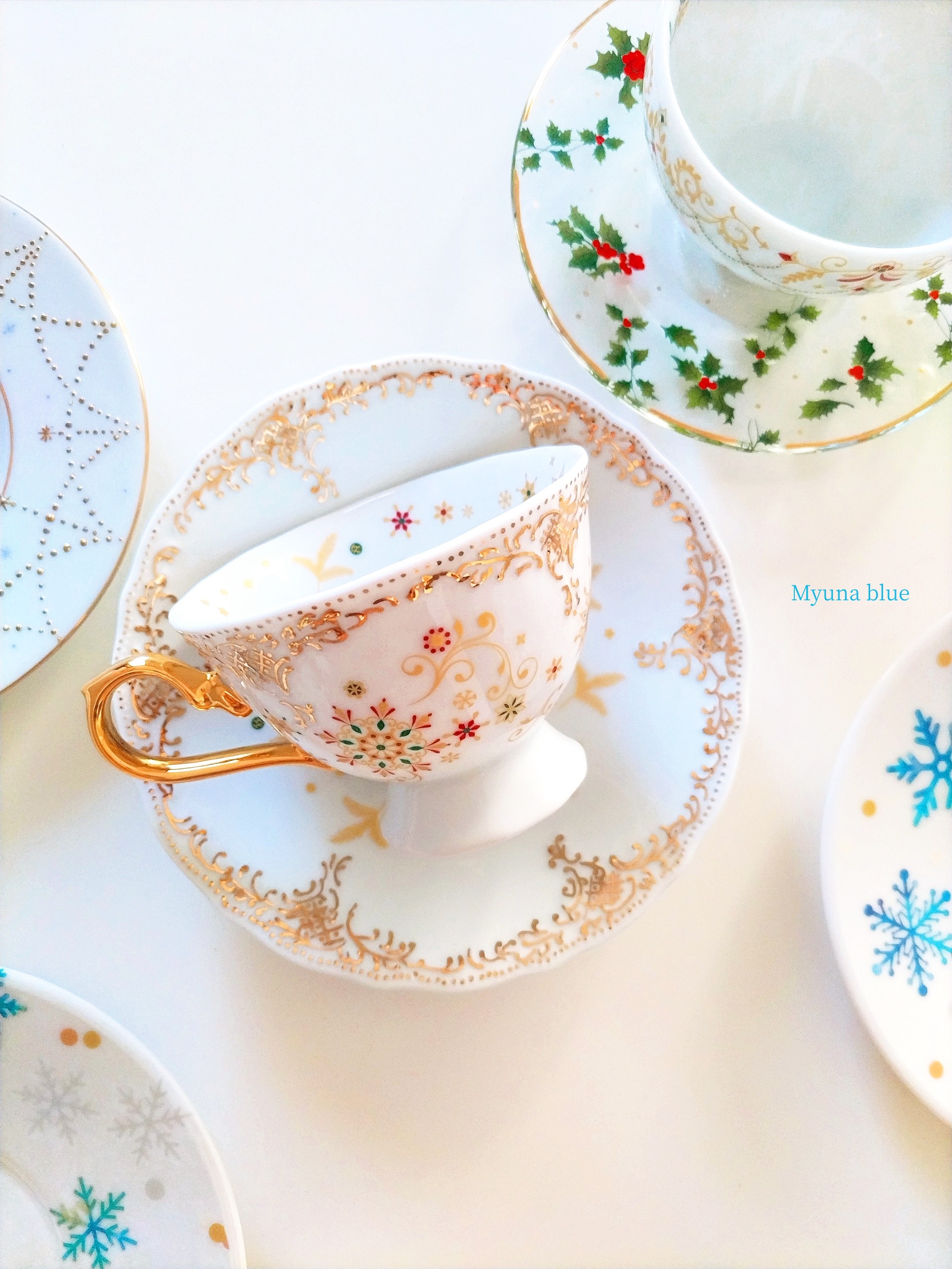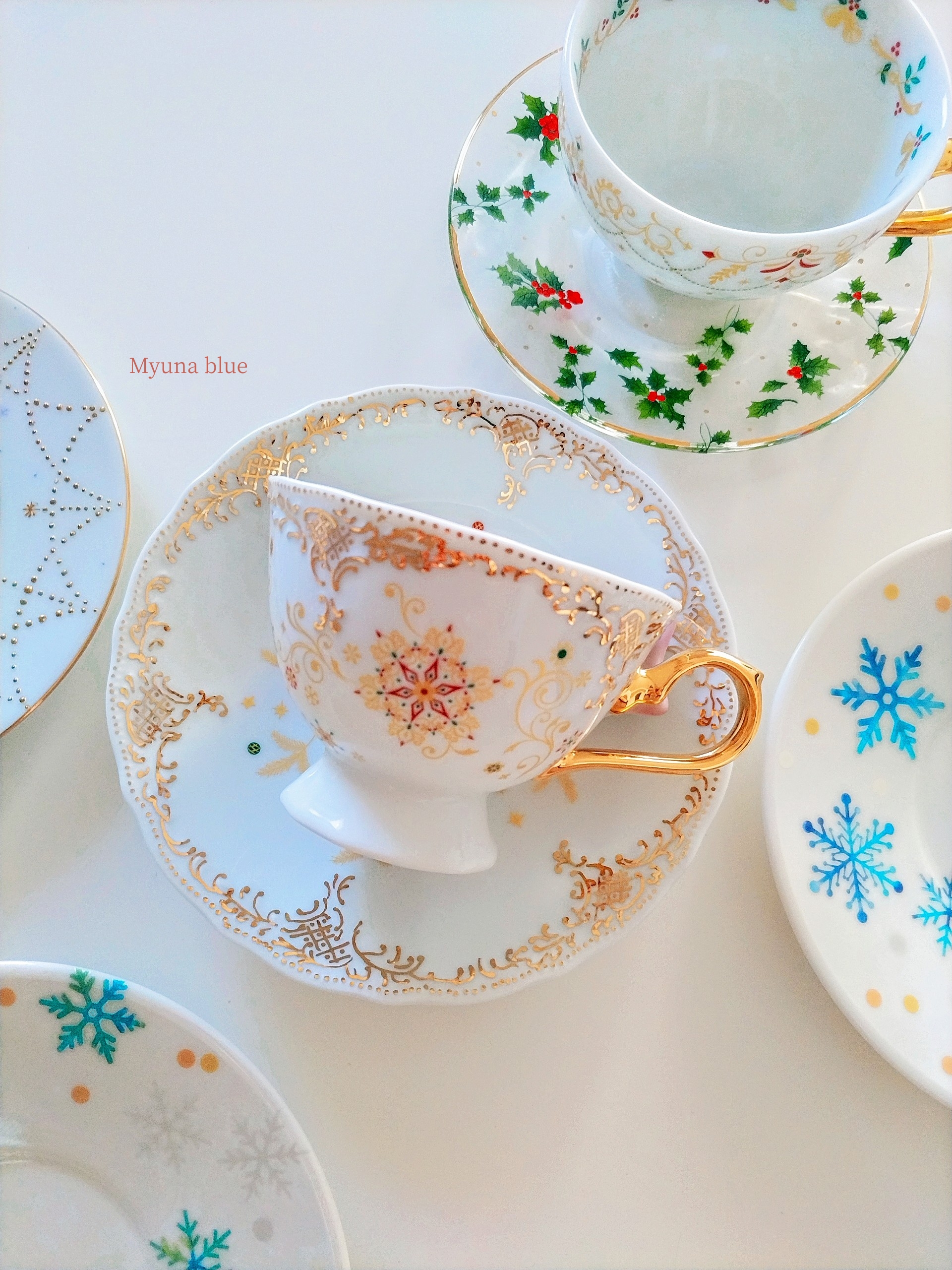 小学生の女の子が作ったカップアンドソーサーです。金彩たっぷりで特別感のあるカップになりました。クリスマスパーティーで使うのが楽しみです。