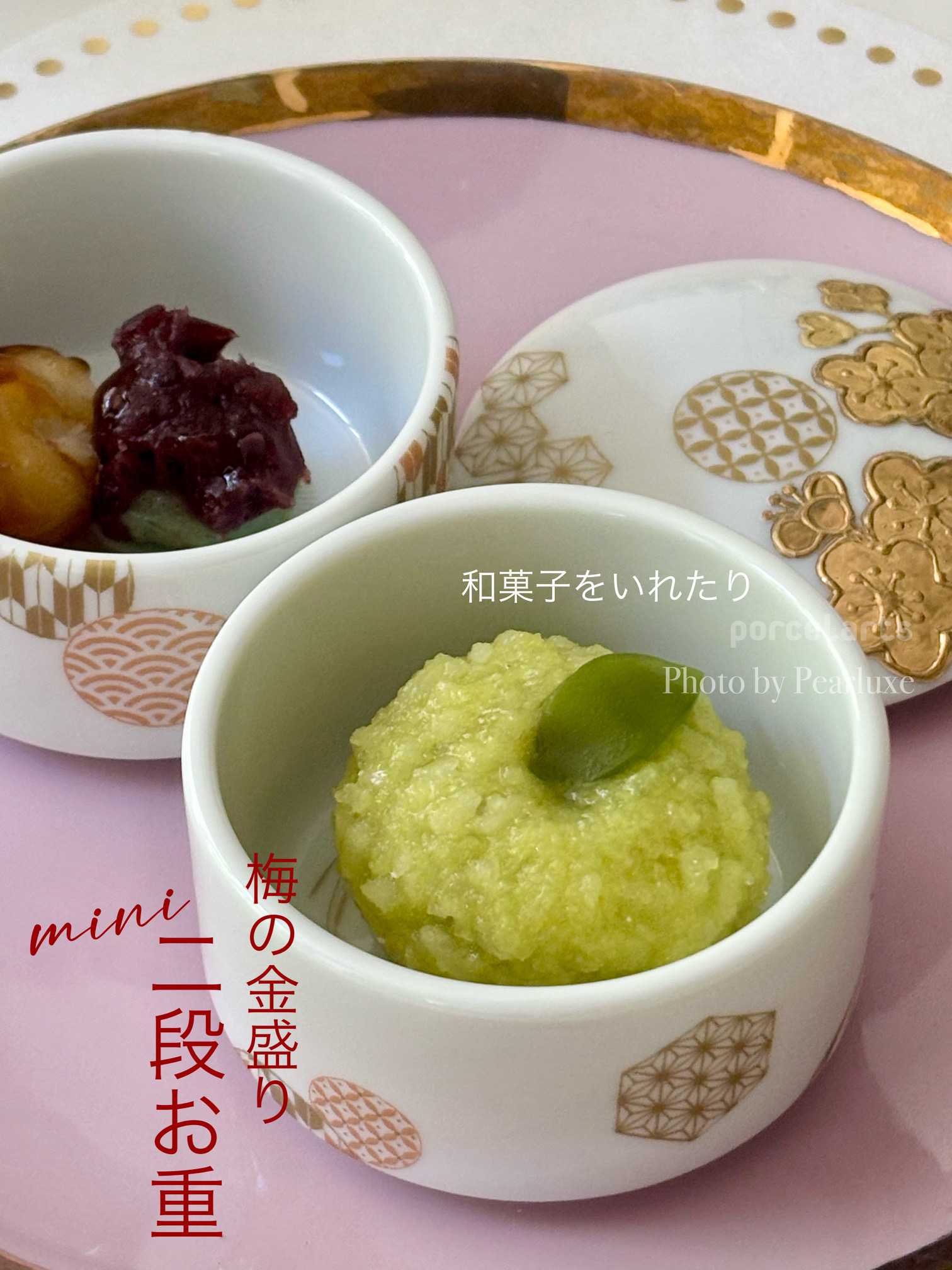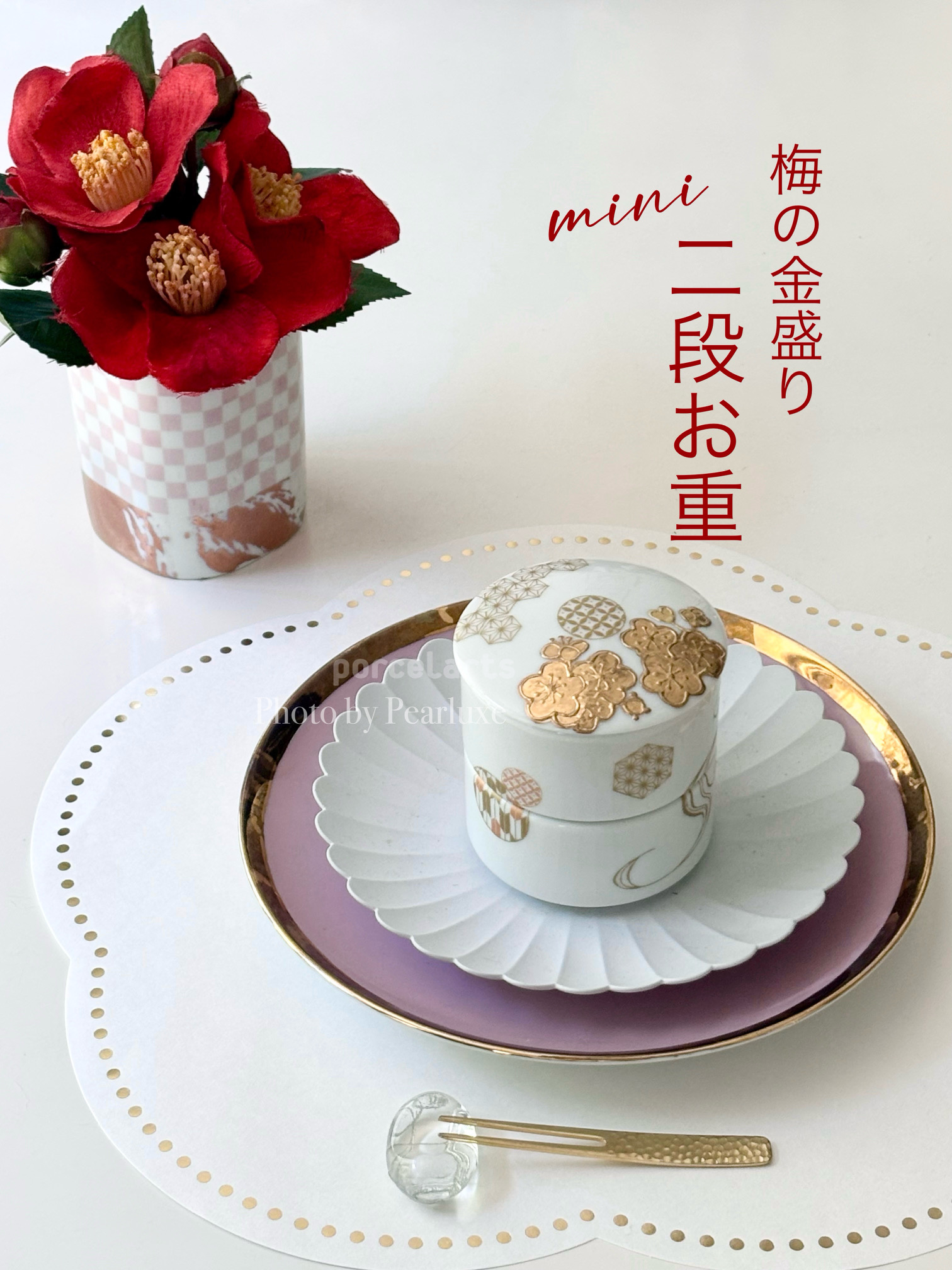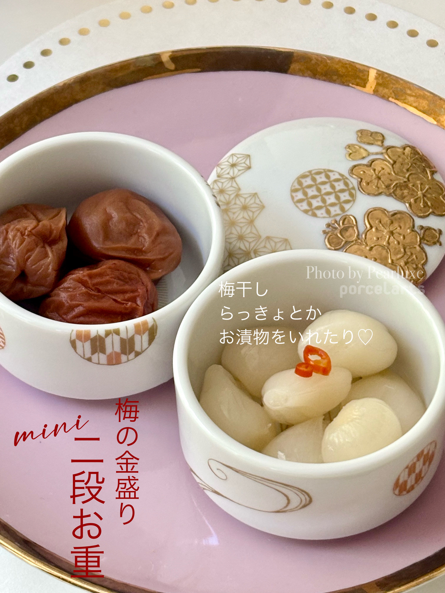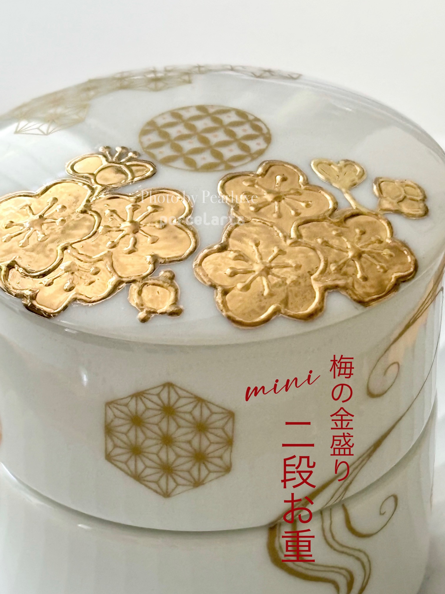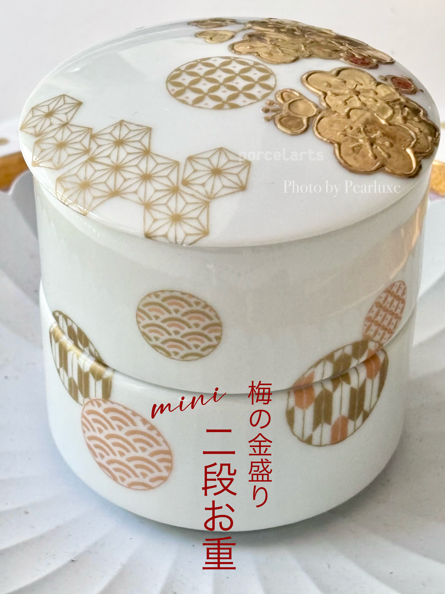 日本の伝統文様(青海波、七宝紋様、麻の葉、矢絣)をあしらいつつ、金盛りで梅を描いてみました♡ 手のひらサイズのミニお重。よくレッスンスイーツのおもてなし和菓子を入れたり、漬物や梅干しをいれて使っています。 一手間かけて作った作品。何世代にも渡って受け継いでいけるような本物志向な作品作りができるのもポーセラーツの醍醐味です♡