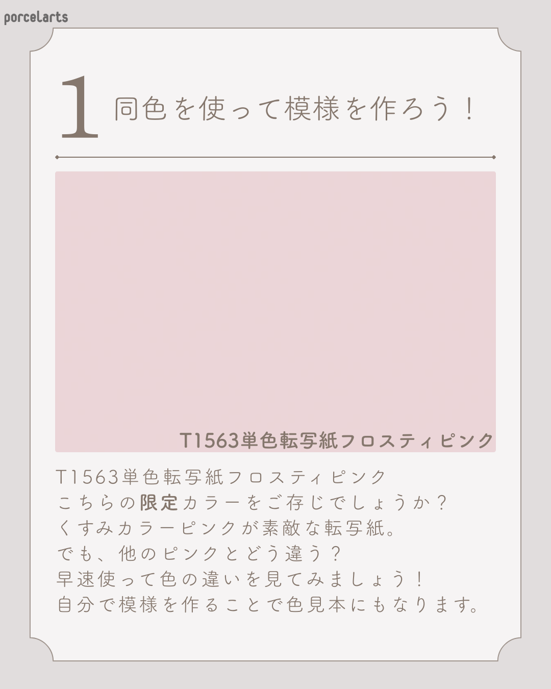 公式Instagramにも掲載しています。 トレンドカラー「T1563 単色転写紙フロスティピンク」を使用した作品をご紹介します。フロスティピンクはくすみピンクがとっても可愛いです。 3色のトーンの違うピンクを使ってアーガイル柄を制作しました。 簡単で可愛いアーガイル柄、大きさを変えても楽しめます。作ったあとは色見本としても使用できますよ。