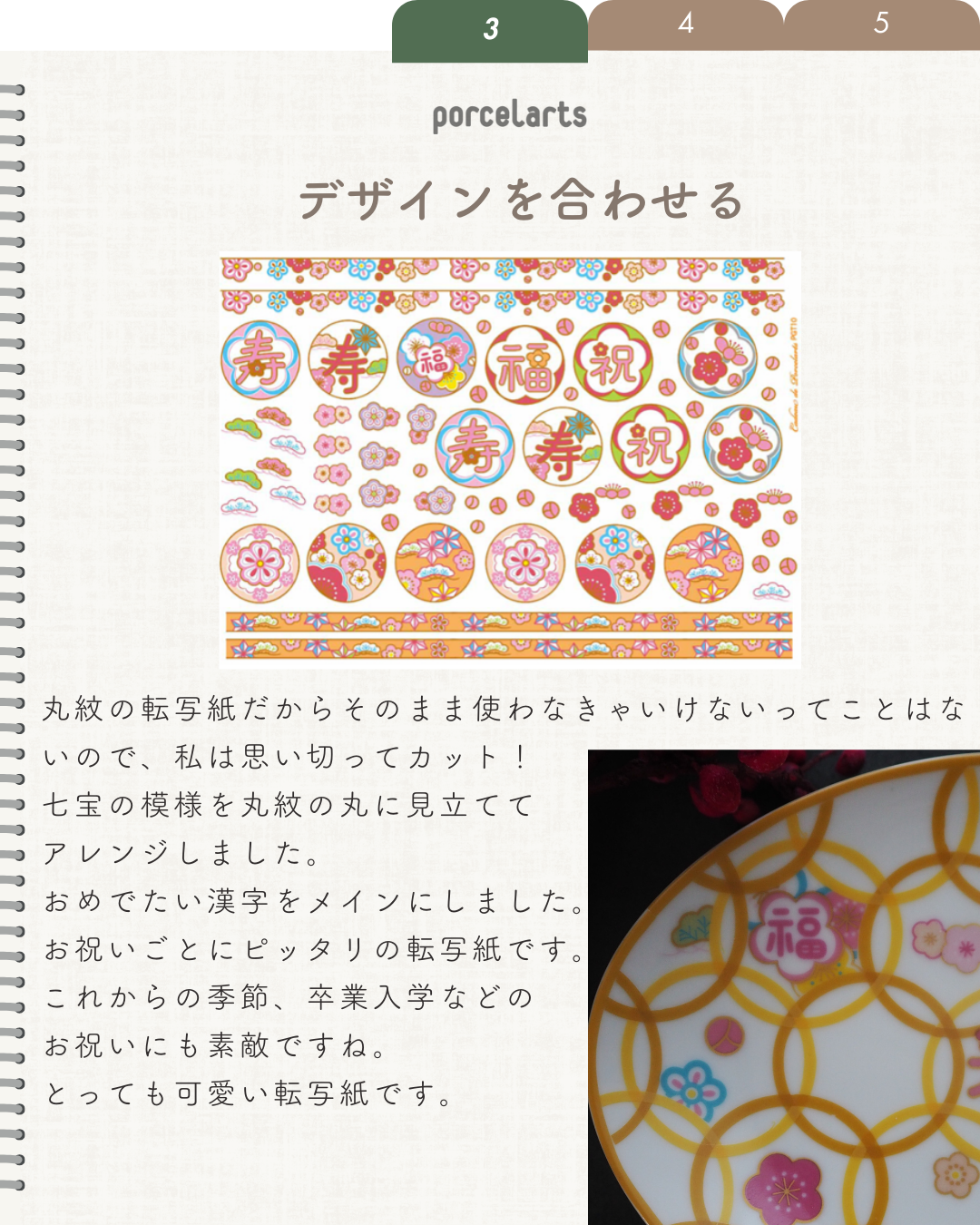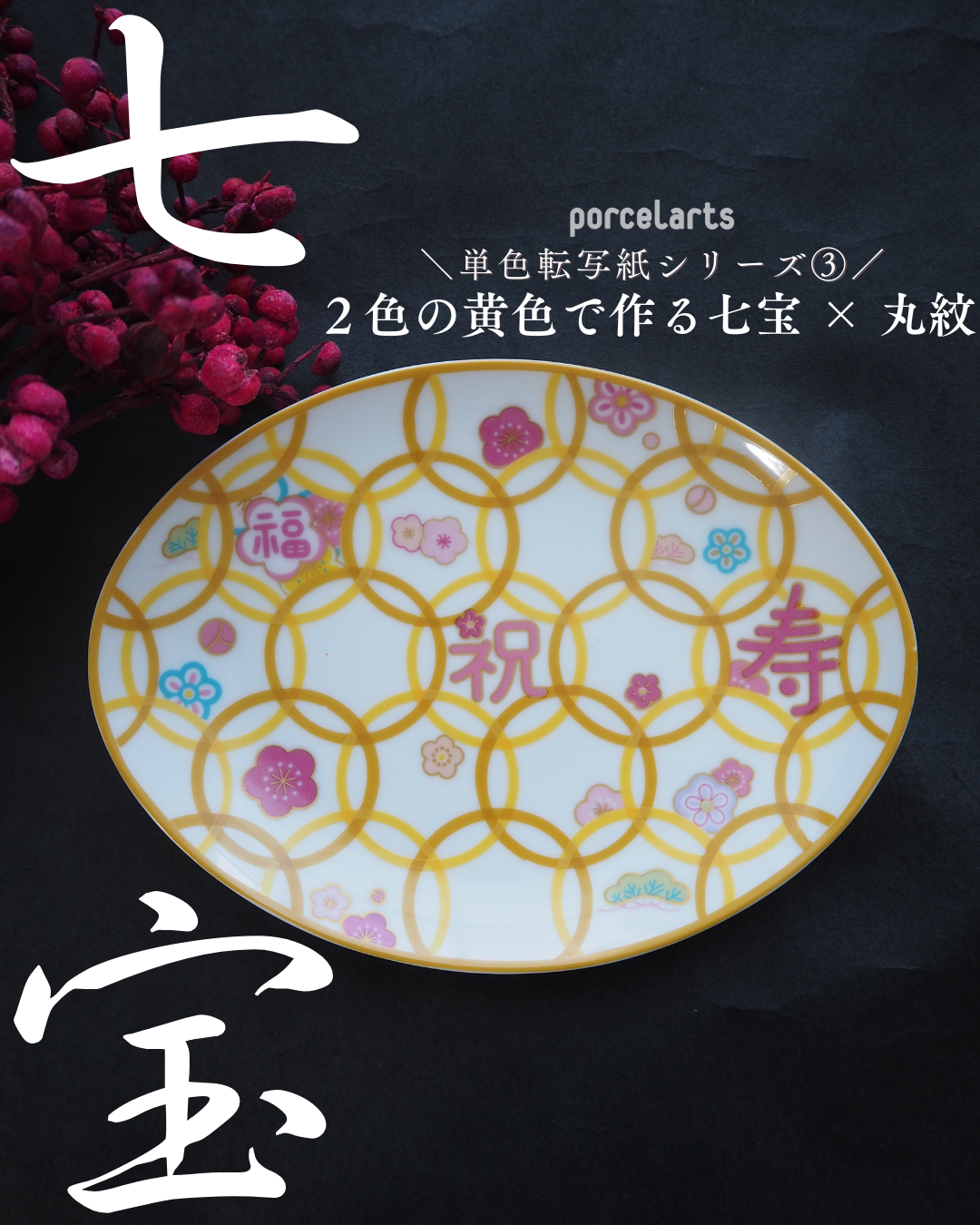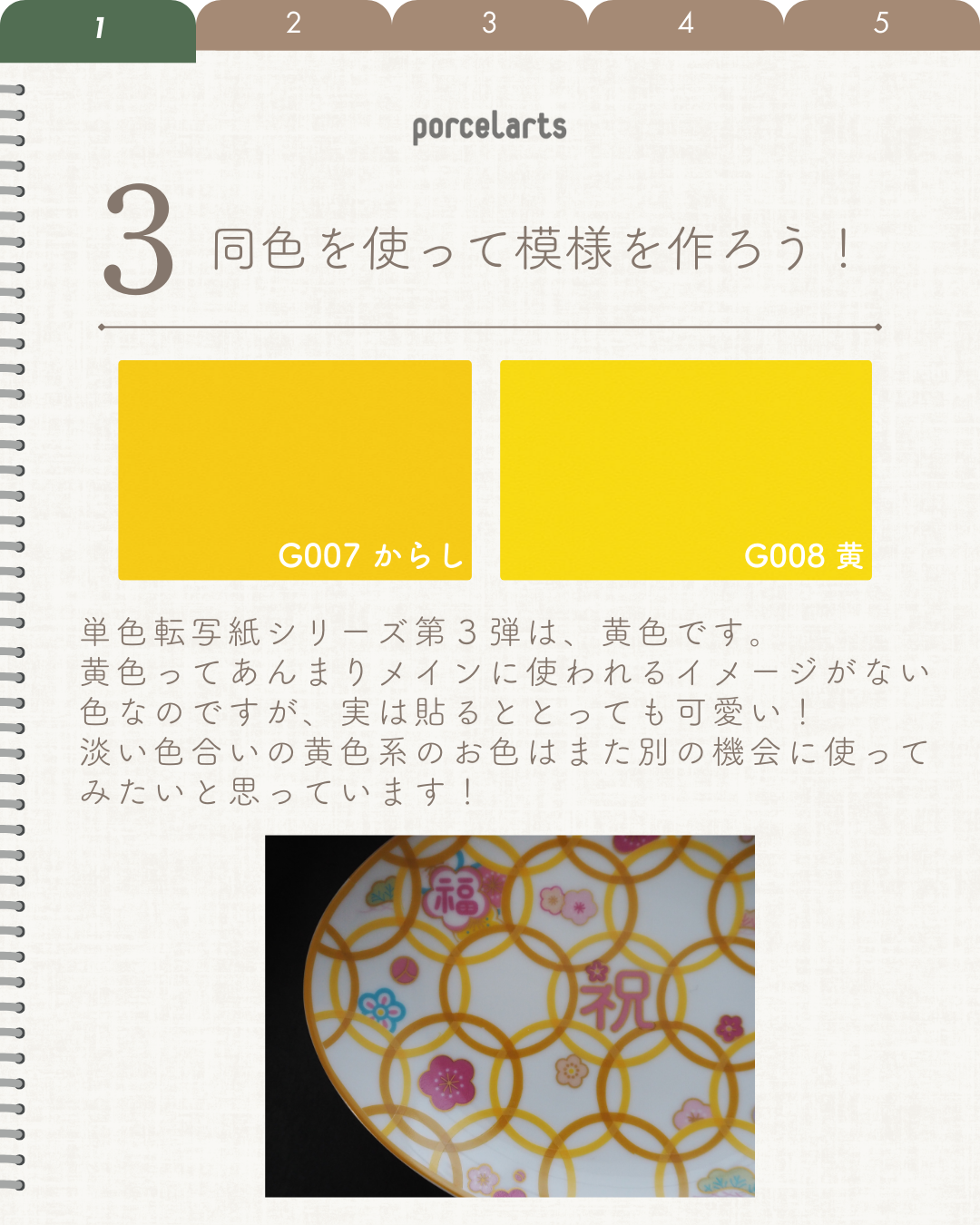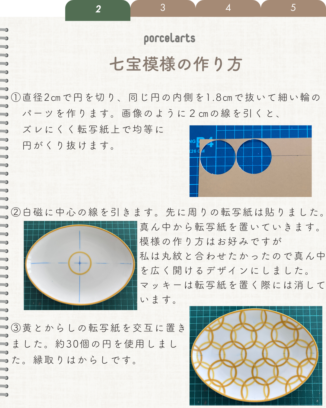 公式Instagramにも掲載しています。 2色の黄色でコンパスカッターを使って七宝模様を作ってみました。 セールの丸紋転写紙を合わせると可愛さ倍増です。 作り方はとっても簡単! コンパスカッターでお好きなサイズでくり抜いたものを重ねていくだけ! 1度焼成にしたかったので、転写紙は3枚重ならないように気を付けています。