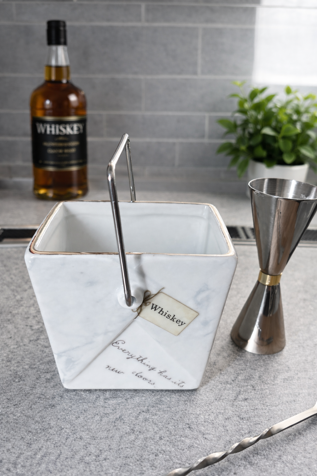 ウイスキー好きな主人へ カクテルメジャーなどが入るメタルハンドルバスケットを作りました 気に入ってくれたようで何よりです