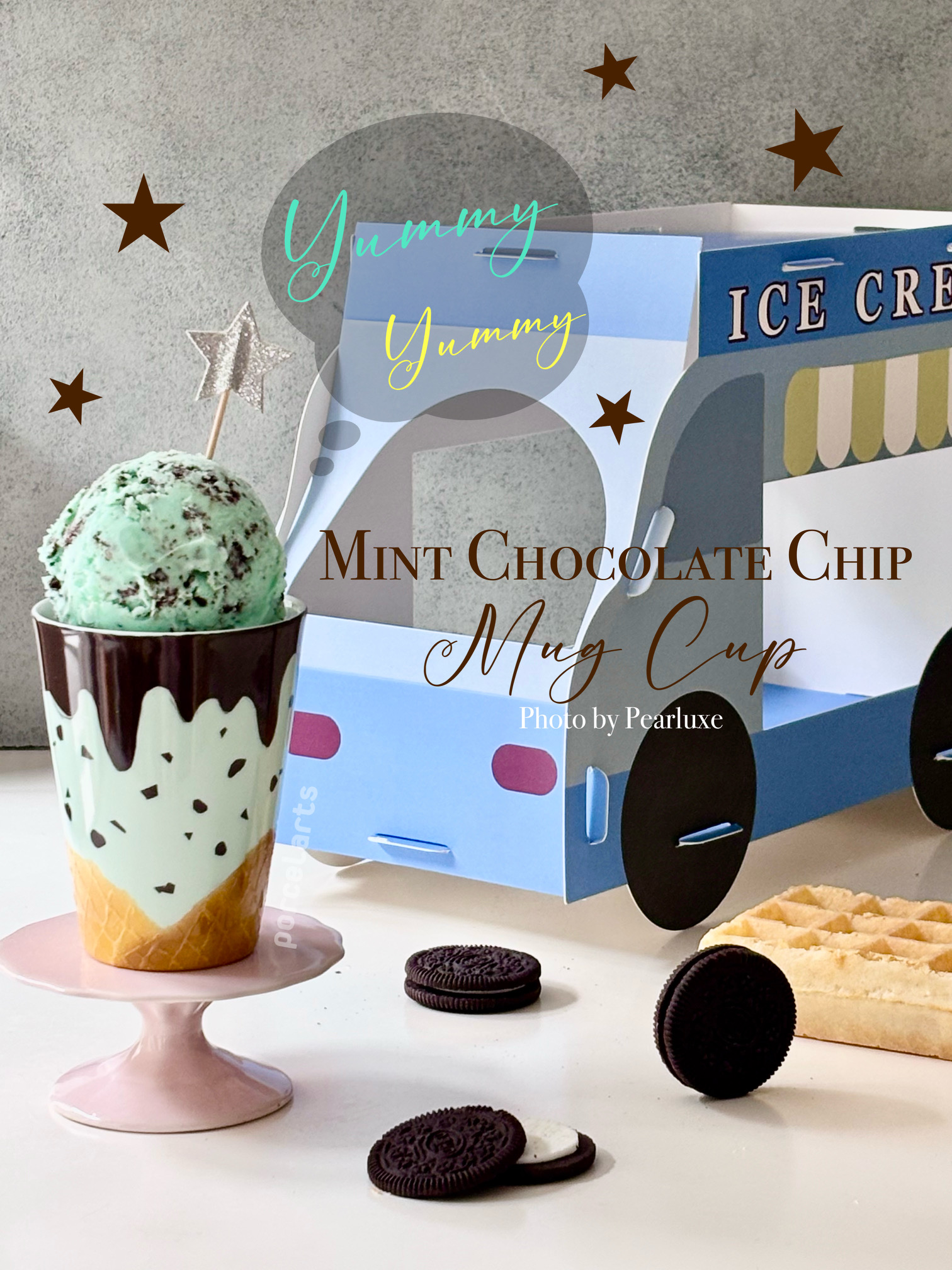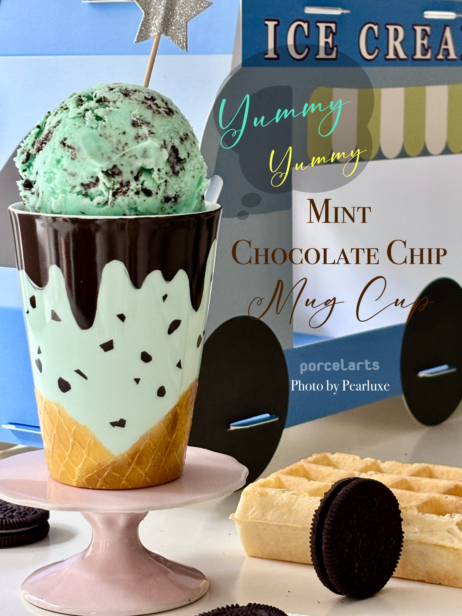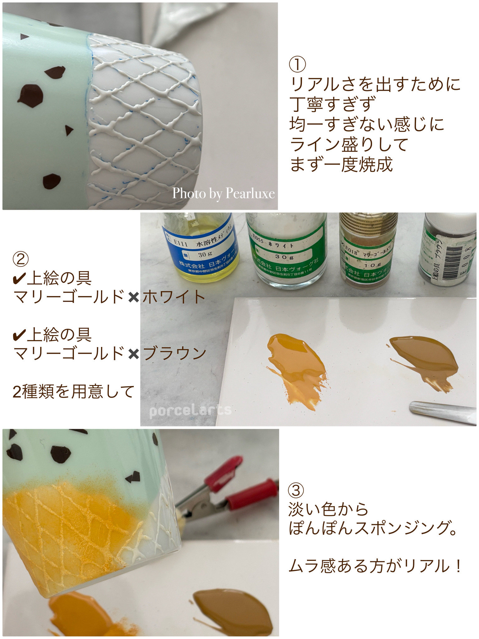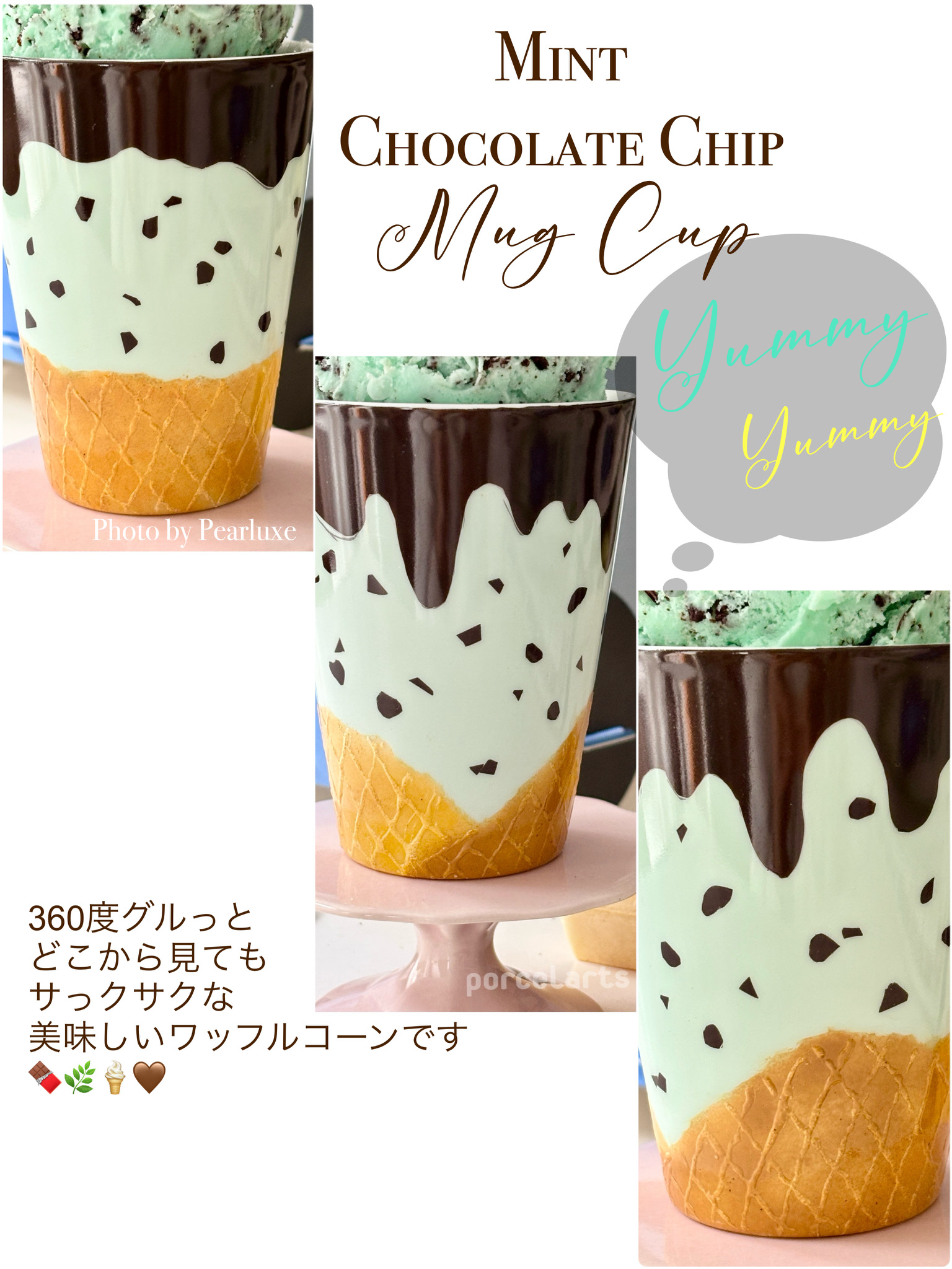 チョコレート色の単色でチョコミント♡コーン部分は、上絵の具と盛りでリアルにしました。