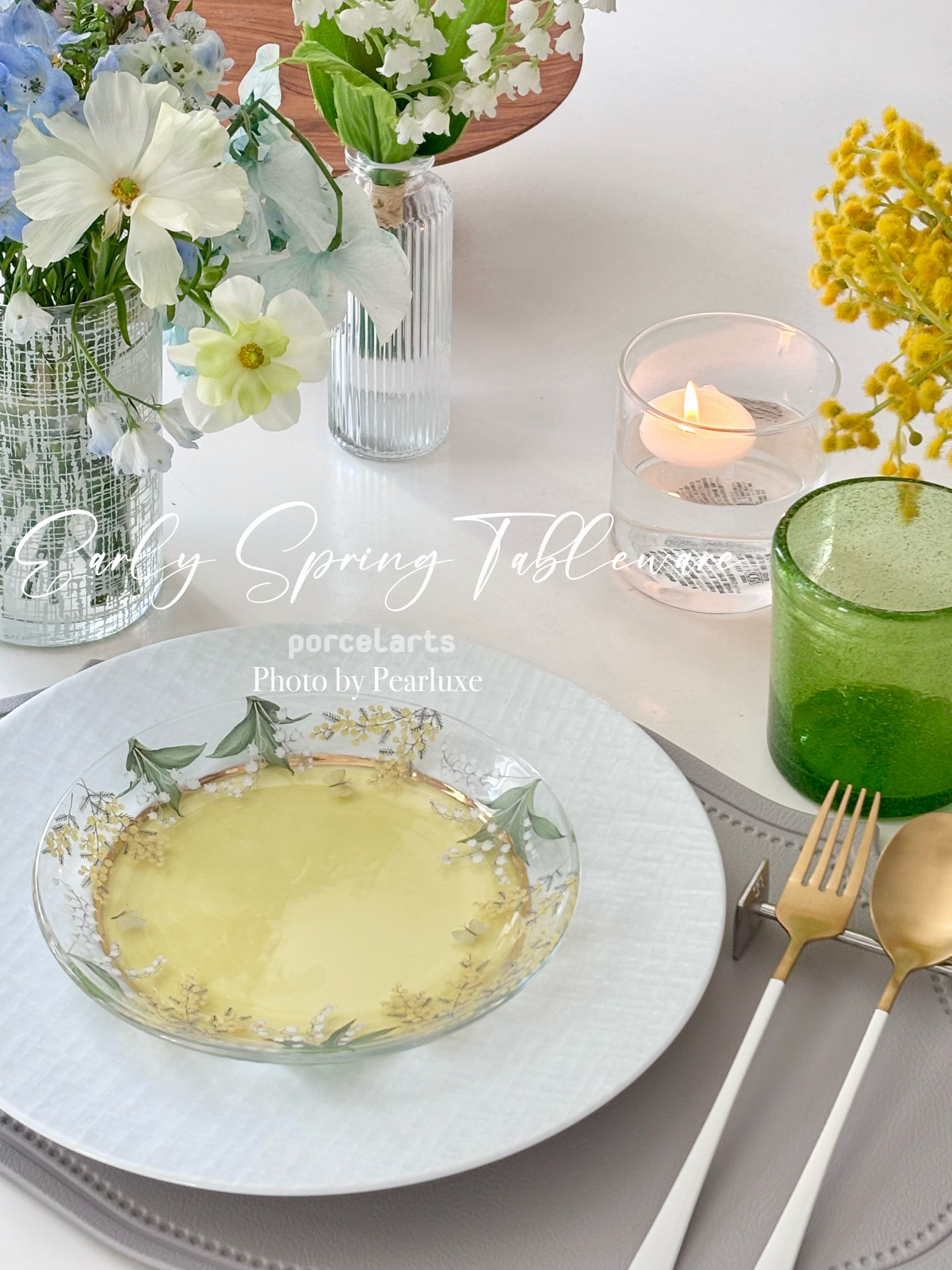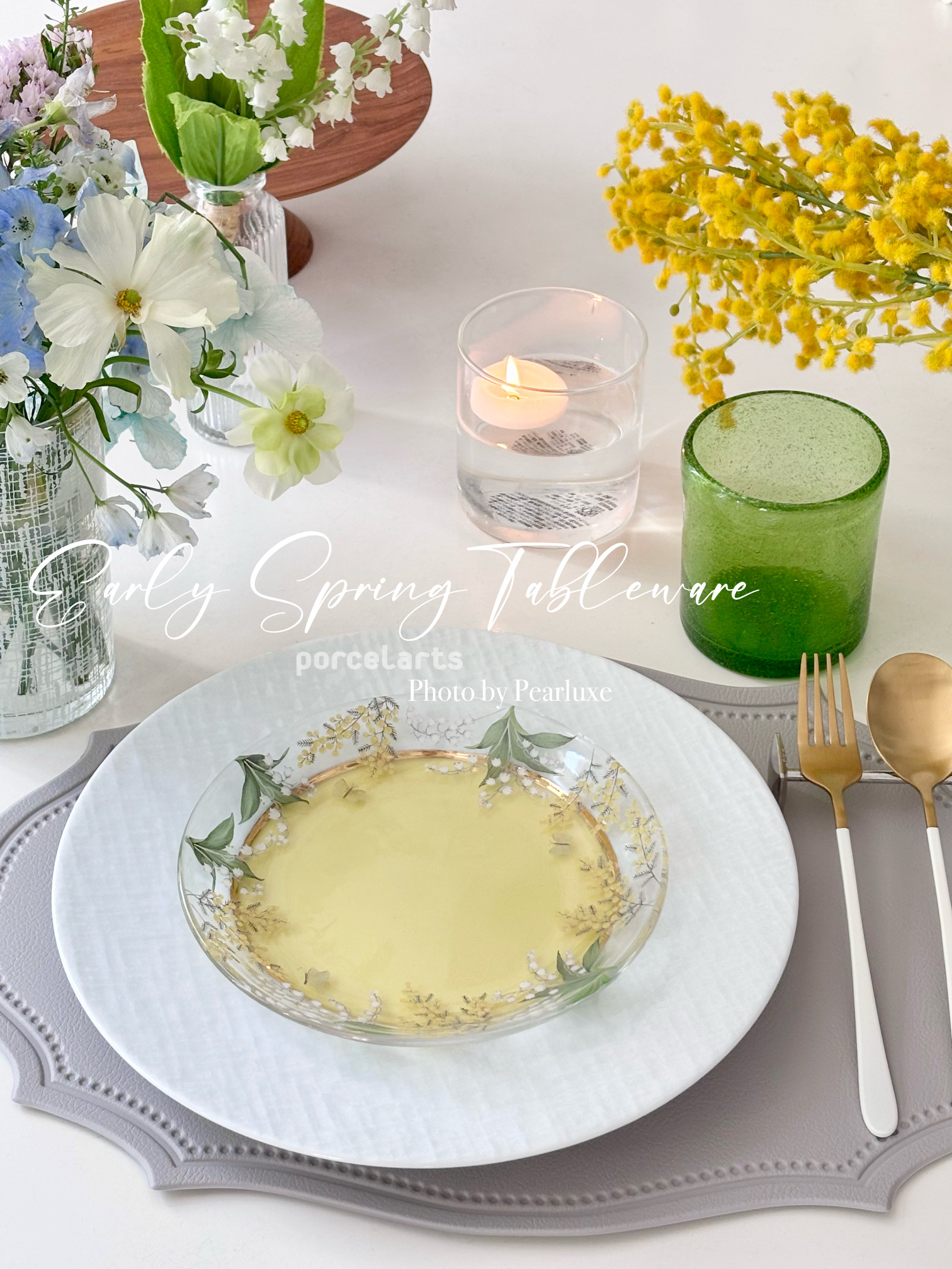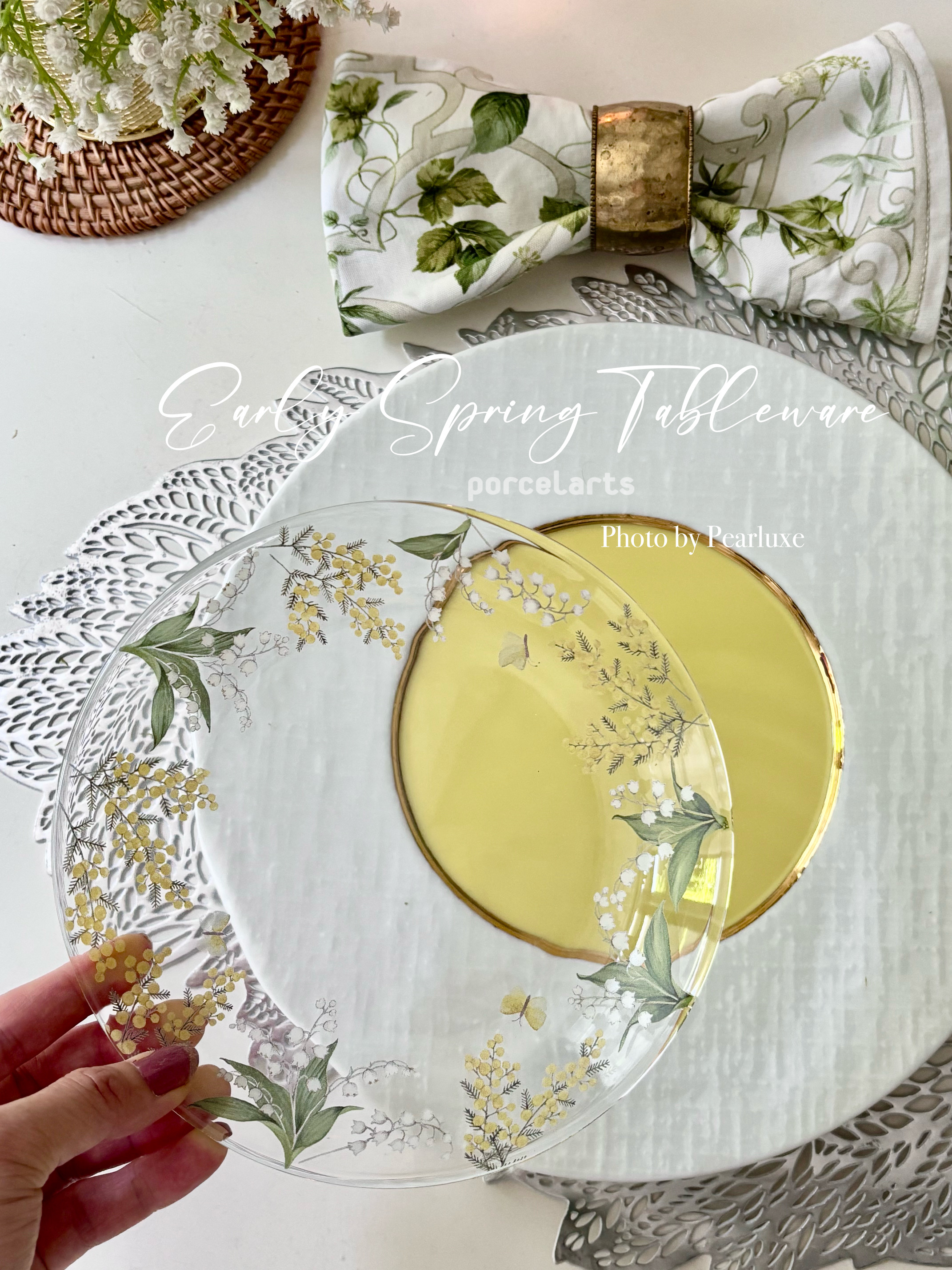 ガラスの特性『透け感』を活かしたプレートの重ね使い♡ ミモザ&すずらんの両方のモチーフが入ってるガラス転写紙がとっても可愛いです。 ミモザの日(3月8日)、すずらんの日(5月1日)に使うのも楽しみです♪