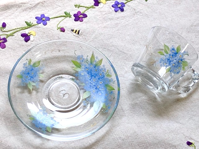大好きな勿忘草とミモザをアメリカンでガラスに描きました