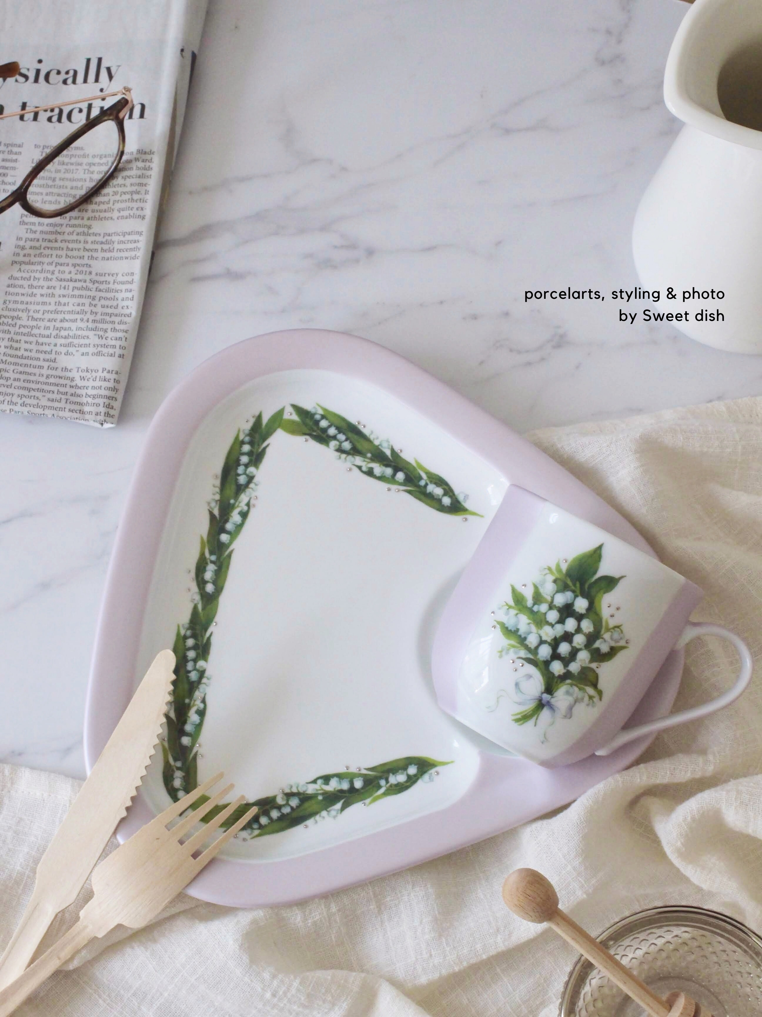 2020春の限定カタログ掲載作品です。幸せの象徴として愛されているすずらん転写紙を使って、朝食セットを作成しました。生徒様からも好評です。5月1日はすずらんの日。ウェディングギフトなどにもぴったりの転写紙だと思います。