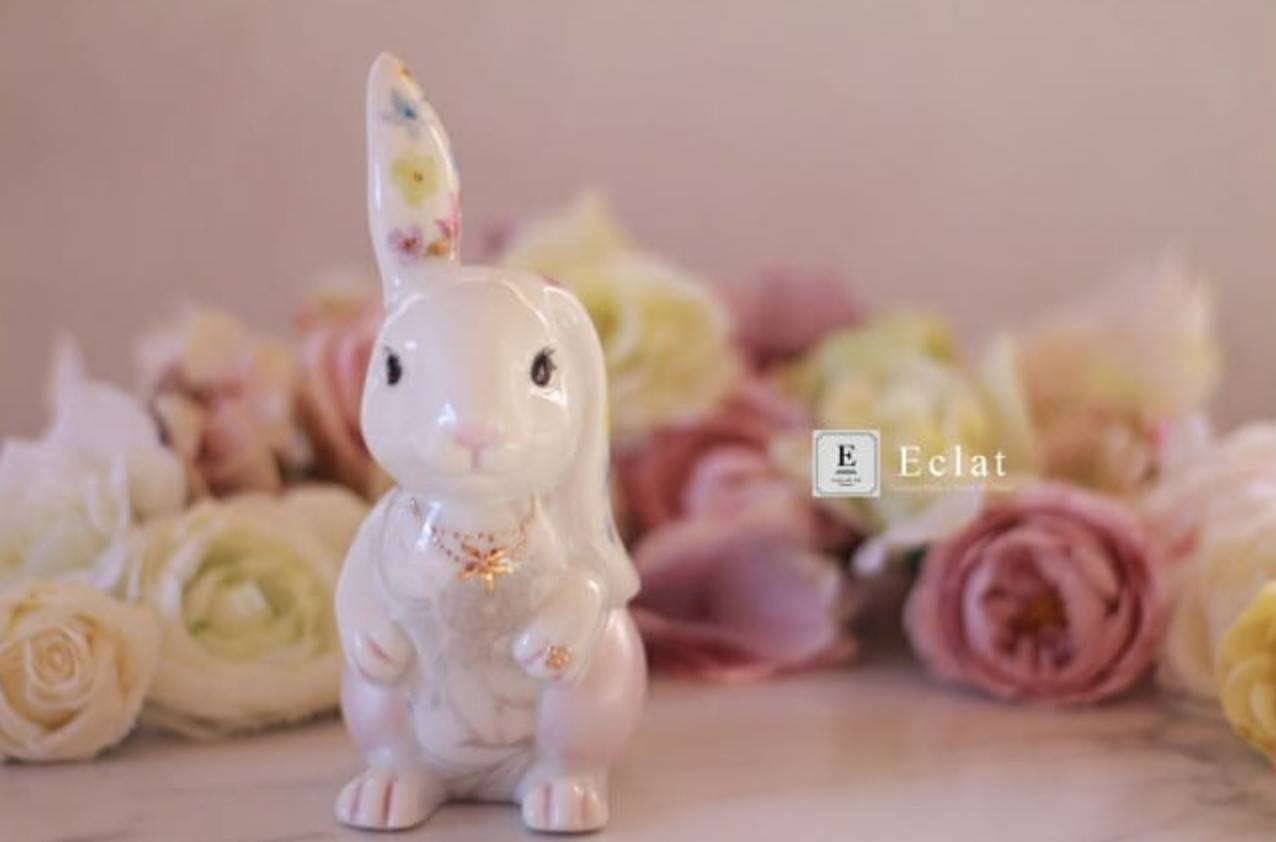 お洋服を着せて、お花畑で楽しく過ごすスイートバニーをイメージして制作しました。目が優しくなるように、上をツヤグロ・下をブラウンで描いています。