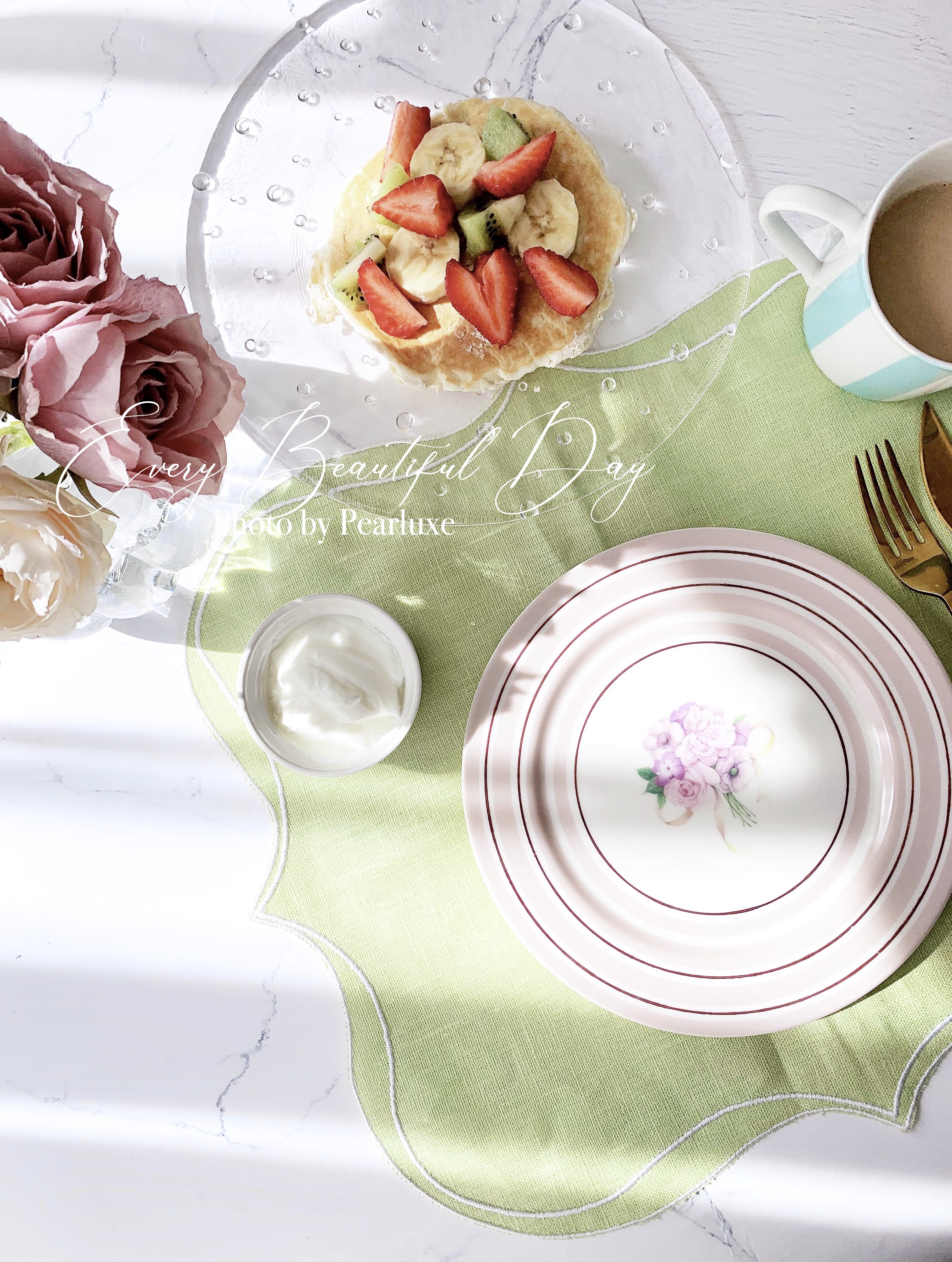 くすみピンクが可愛いグリーオラージュ転写紙をコンパスカッターでサークルにカットし、さらにピンクゴールド色のマーカーでも何行かに金彩したプレート作品です。 おうちで過ごす春に、パンケーキでブランチ時間♡