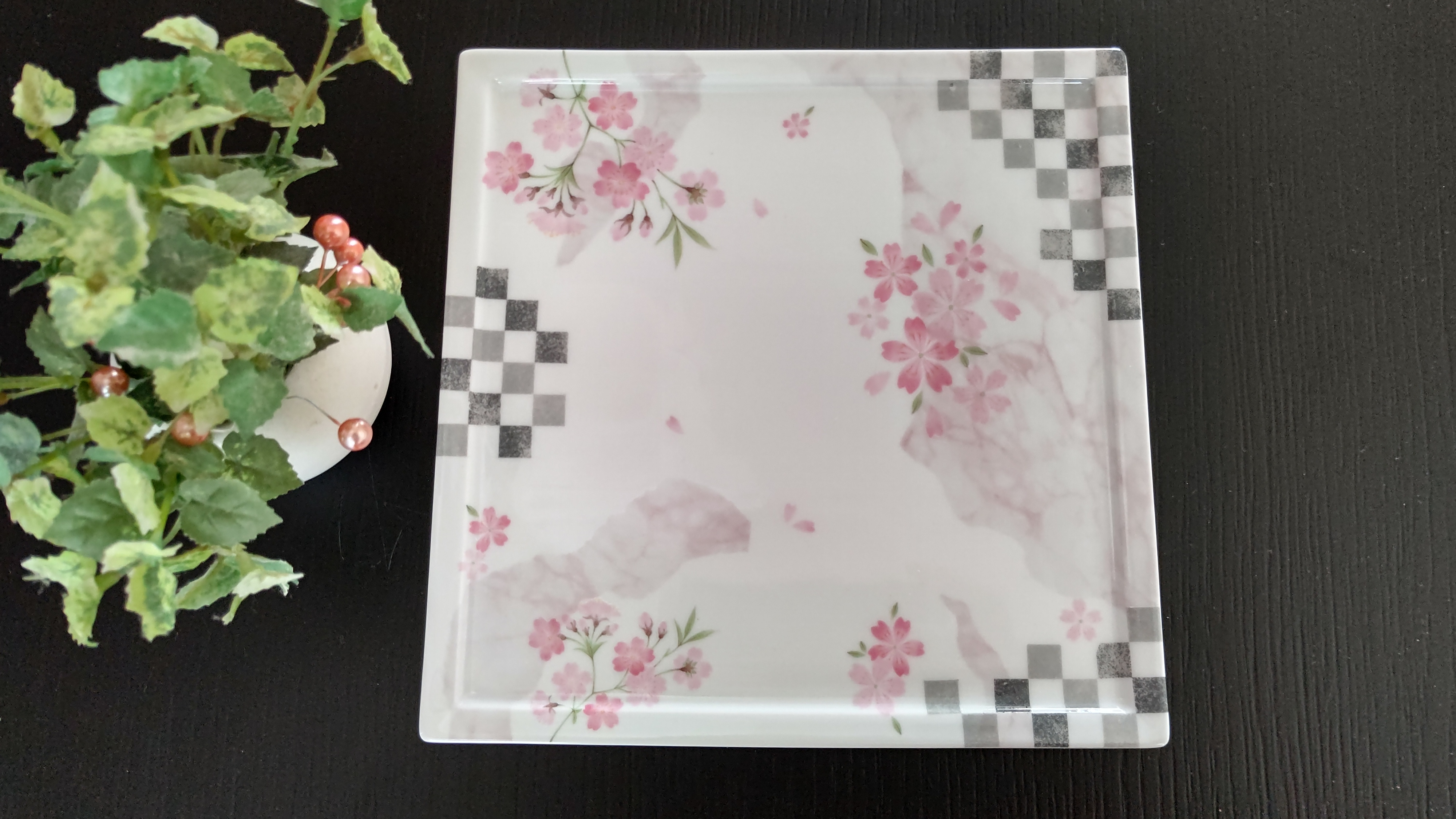 ローズペルレの転写紙を桜に見立て、2018冬の限定商品ブラックチェック柄を縦横の向きに入れることで和風な格子のアクセントにしました