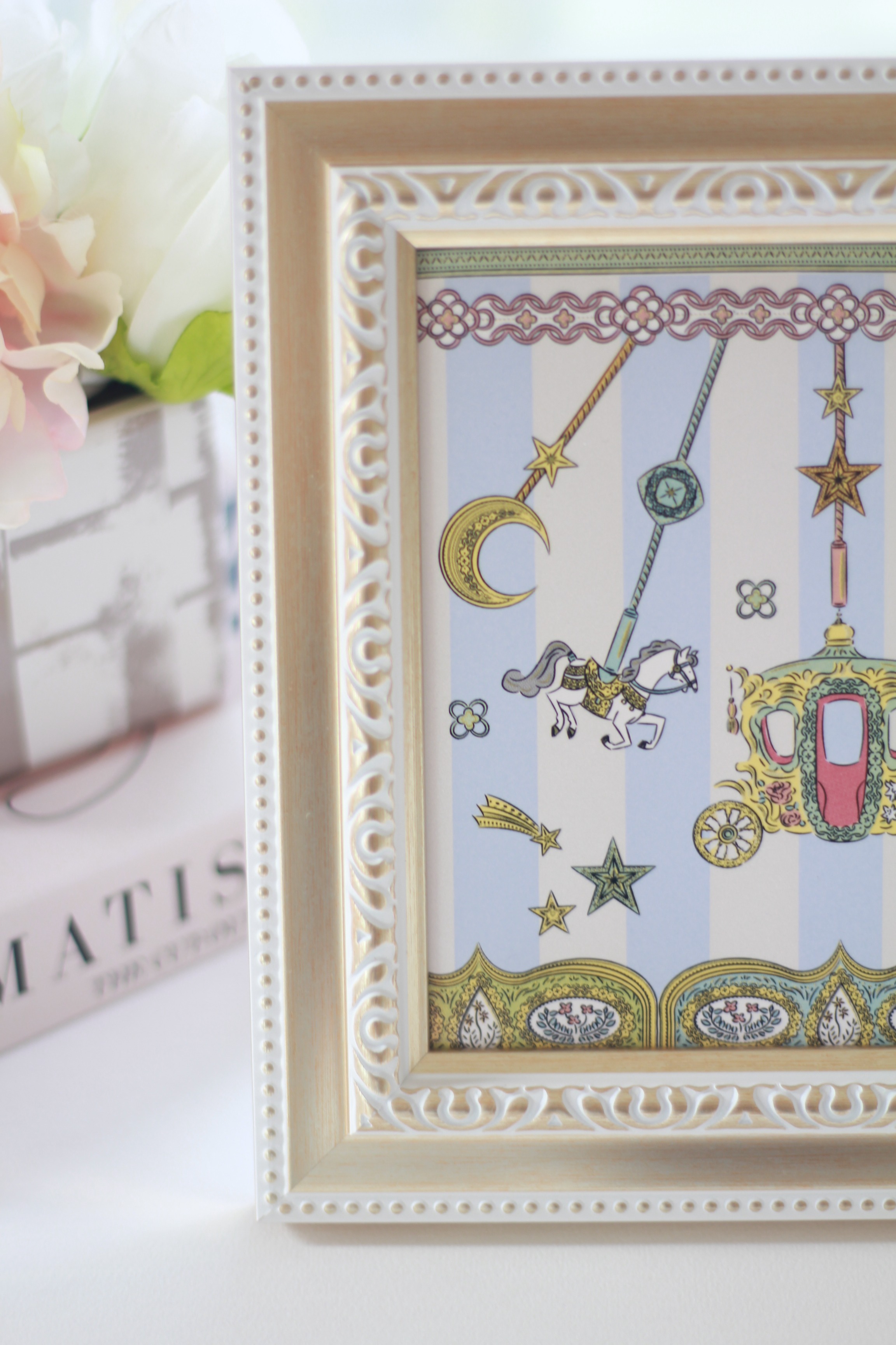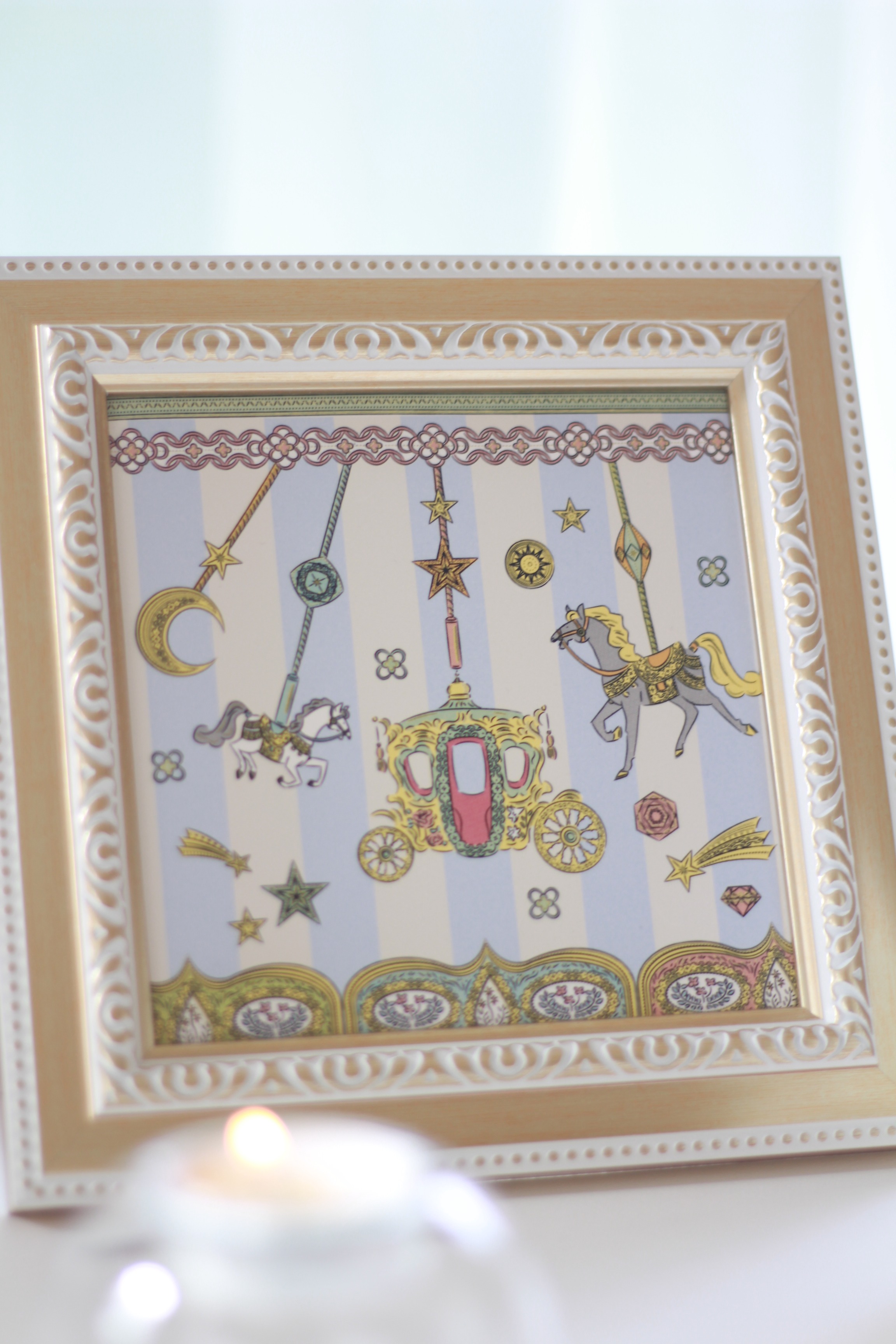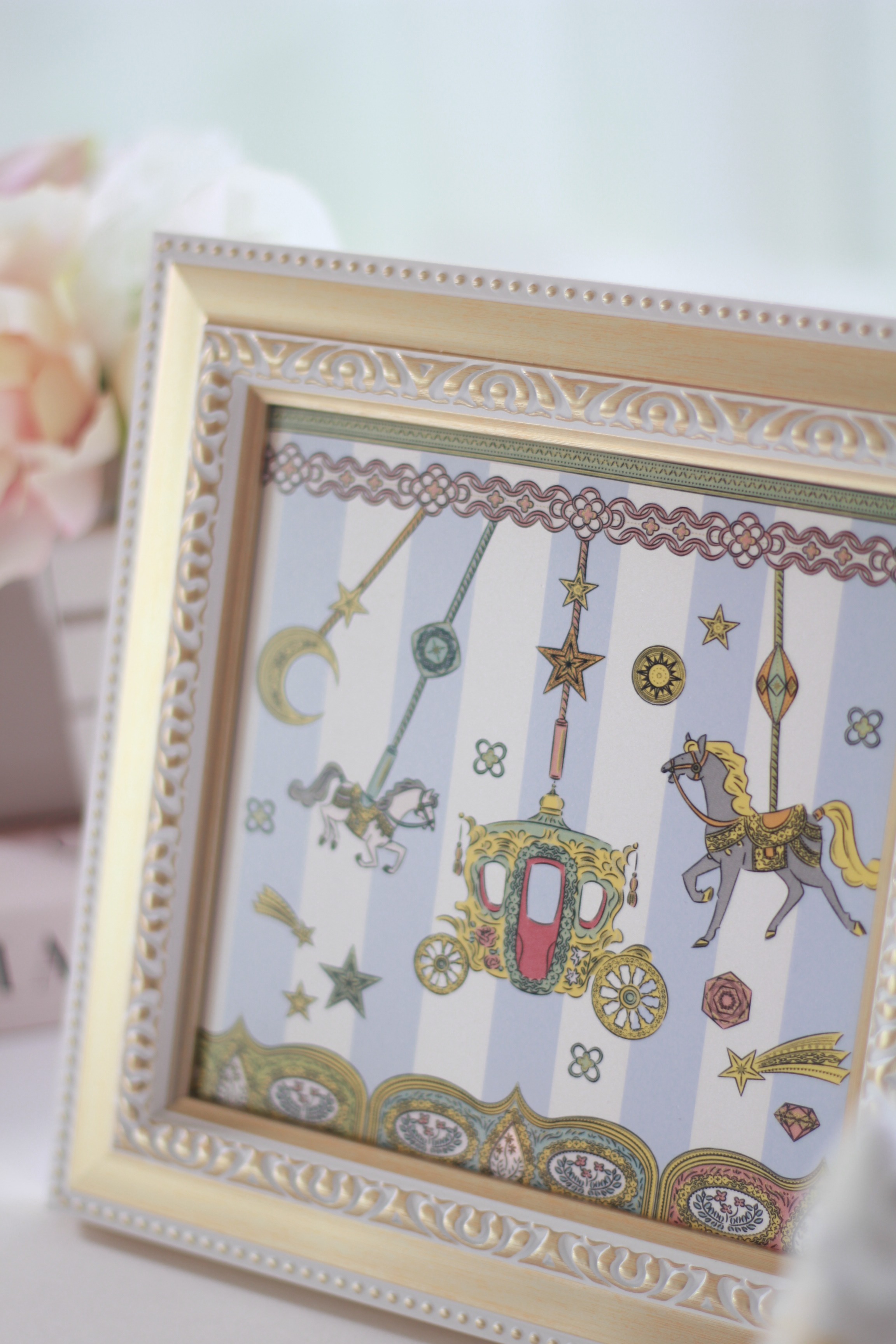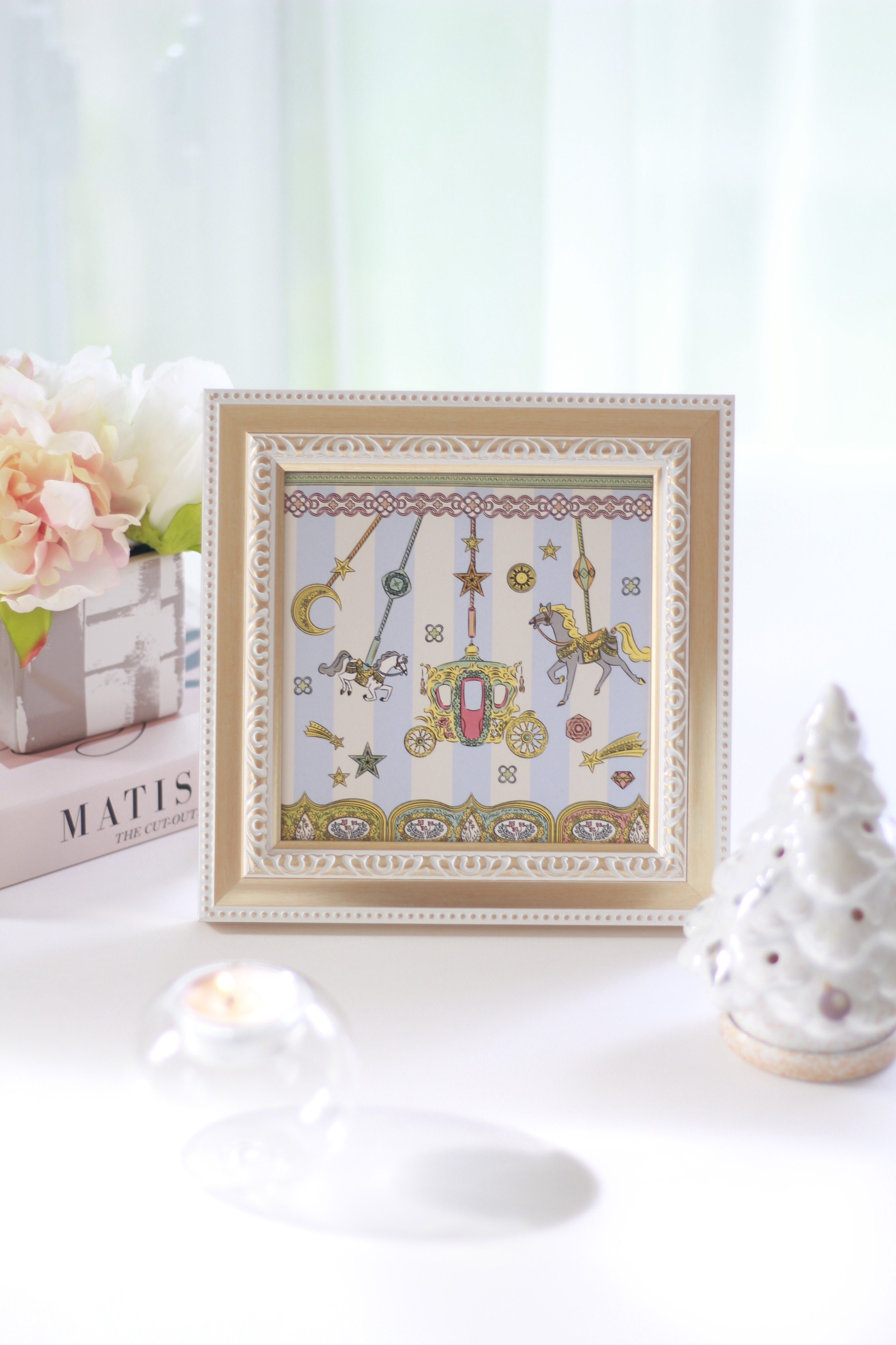キルンアート&ポーセラーツ 2025年 クリスマス&新春限定カタログ 掲載用作品を制作させていただきました。 幻想的な世界観が魅力の転写紙「スターカルーセル」を使用し、 優雅なインテリアタイルに仕上げました。 ゴールドの馬車や星、三日月が描かれたデザインは、まるで夢の中の遊園地。 スターカルーセルの転写紙の色を綺麗に出すために ストライプの上は貼らず、重なり部分はカットしています。 柔らかなパステルシャンパンカラーのブルーとシルバーと組み合わせて背景はストライプにしてみました。
