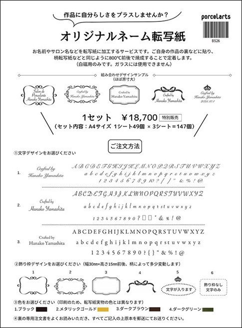 飾り枠・文字デザイン・色を選んで、ご自身のお名前や教室名で「バックマーク(裏印)」用の転写紙を作りましょう!