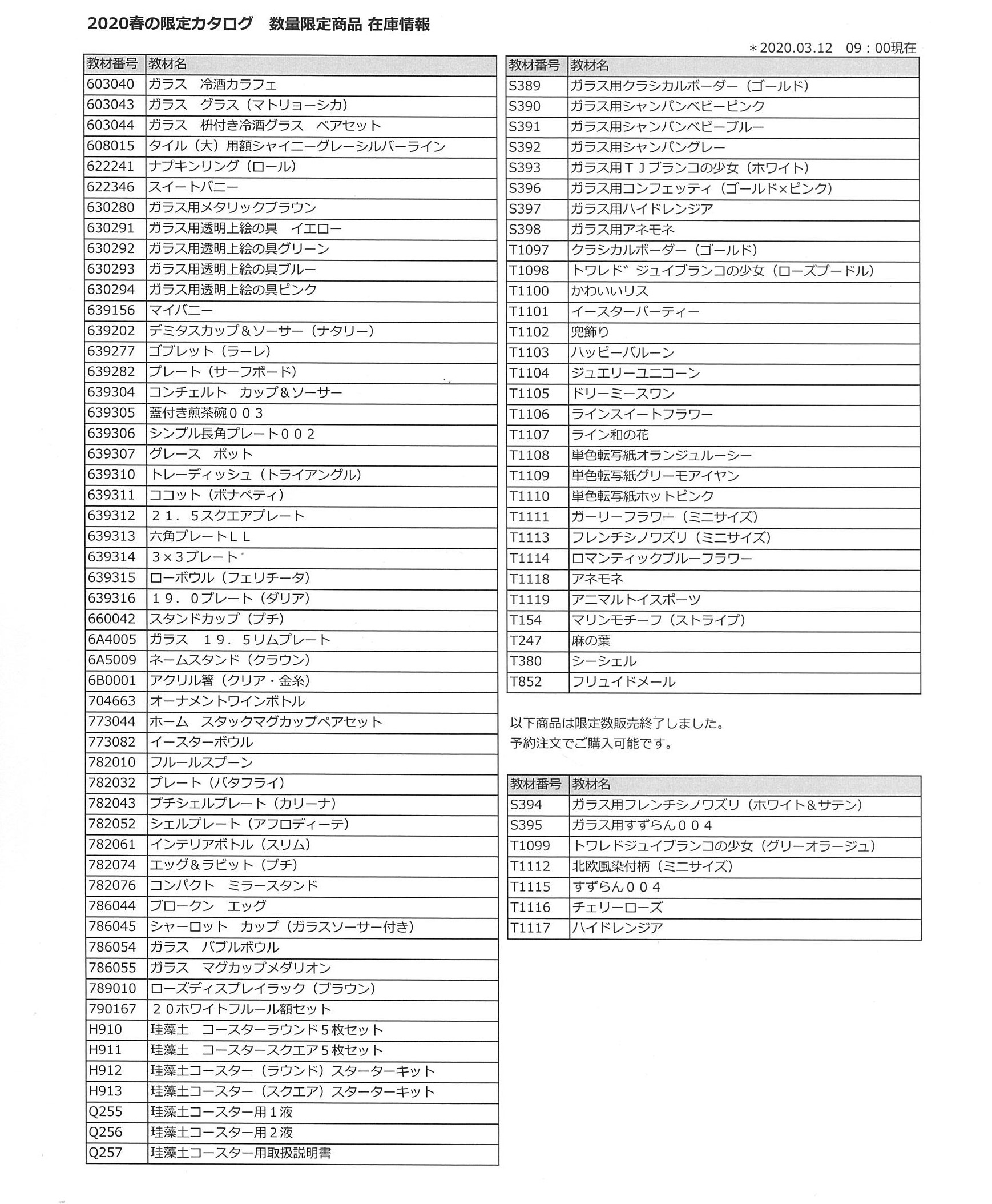 日本キルンアート協会9月発行の「キルンアート&ポーセラーツ 2020 春の限定カタログ」掲載の数量限定商品で在庫のある商品をご案内します。(2020.03.12 AM9:00現在)