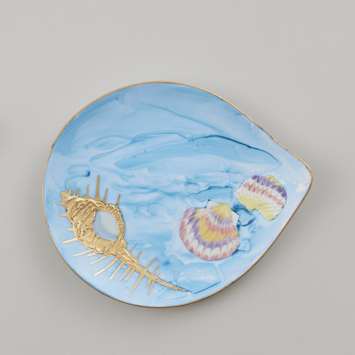 盛り絵の具を使った花や貝殻などのモチーフを加えたアレンジで夏の海のイメージで作品を仕上げます。