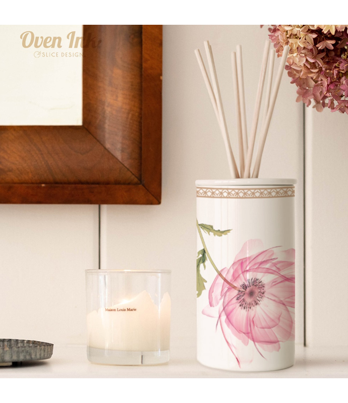 奥行が美しい大花モチーフ。透明感も加わって軽やかなイメージに合う愛らしいカラーリング。ポーセリンアートでは一般的には表現の難しい特殊なピンクトーンを表現