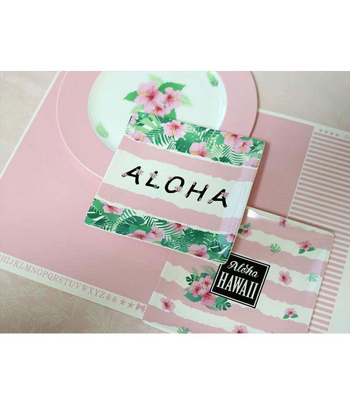 「ハワイアンロゴとハイビスカスアイテム」転写紙と、「花文字アルファベットとハイビスカス」転写紙を一緒に使用しています。