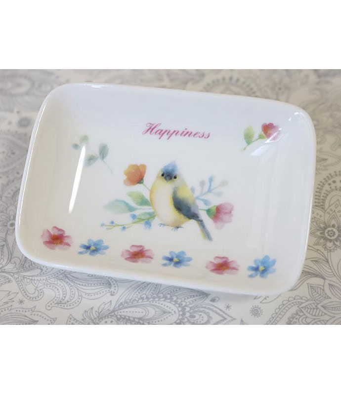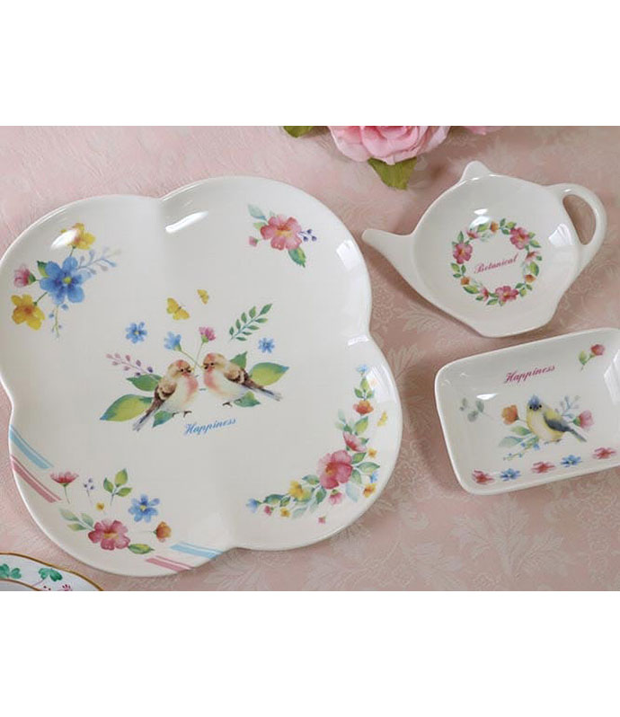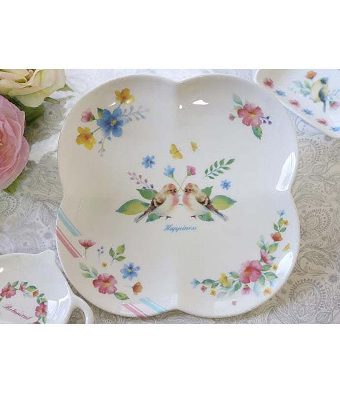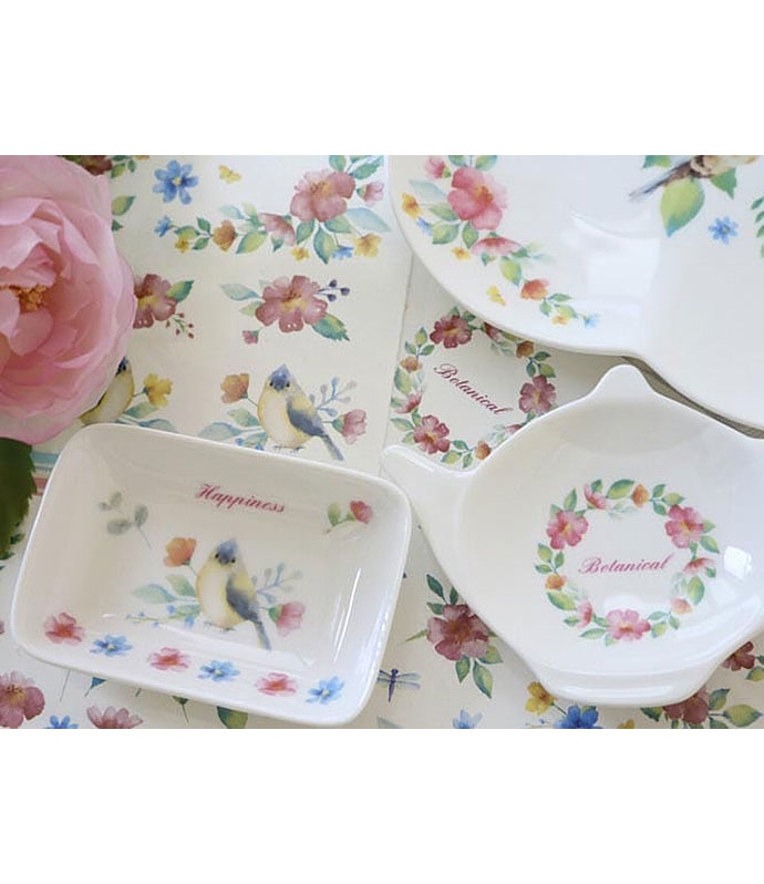 仲睦まじく向かい合う小鳥や、うるうるとした表情できょとんとした小鳥、水彩で表現された花々や蝶たち、様々な形の葉っぱがいっぱいに盛り込まれています。発色も綺麗でテーブルウェアや小物にもお使いいただけます。