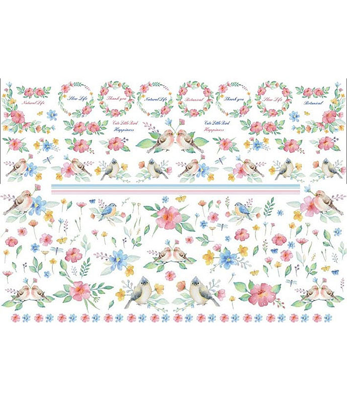 ワンポイントとして使える文字や、ボタニカルのフレーム、同系色のラインも付属しています。小鳥たちも2種類の大きさを準備しましたので、陶器の大きさに合わせてお使いください。