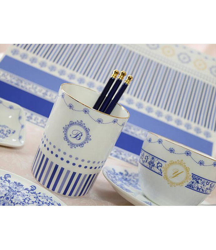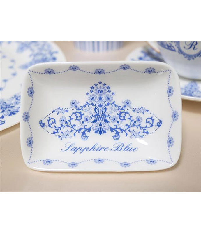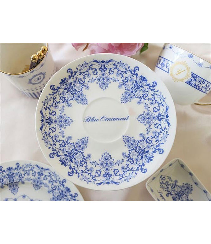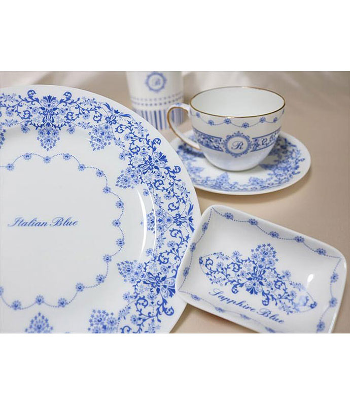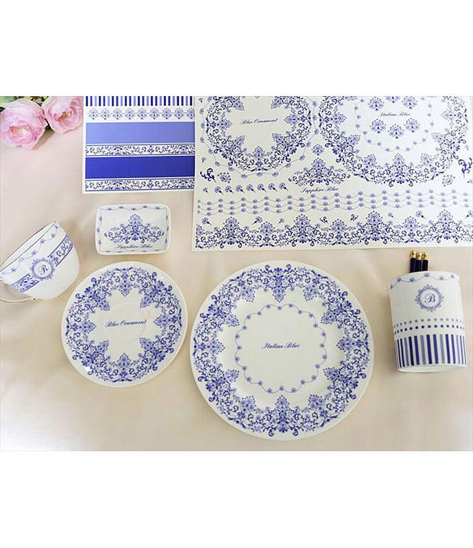 気品のある4色のブルーを組み合わせてデザインされた転写紙です。イタリアのジノリ、英国のスポード等に代表されるヨーロピアン食器に好んで使われるブルーの絵柄や文様は、17世紀~18世紀に中国から輸入された染め付け磁器を基にしたブルーオニオンのモチーフに始まります。