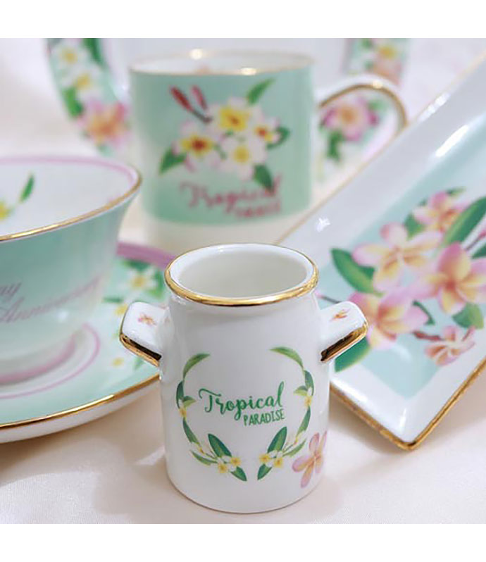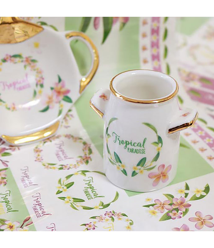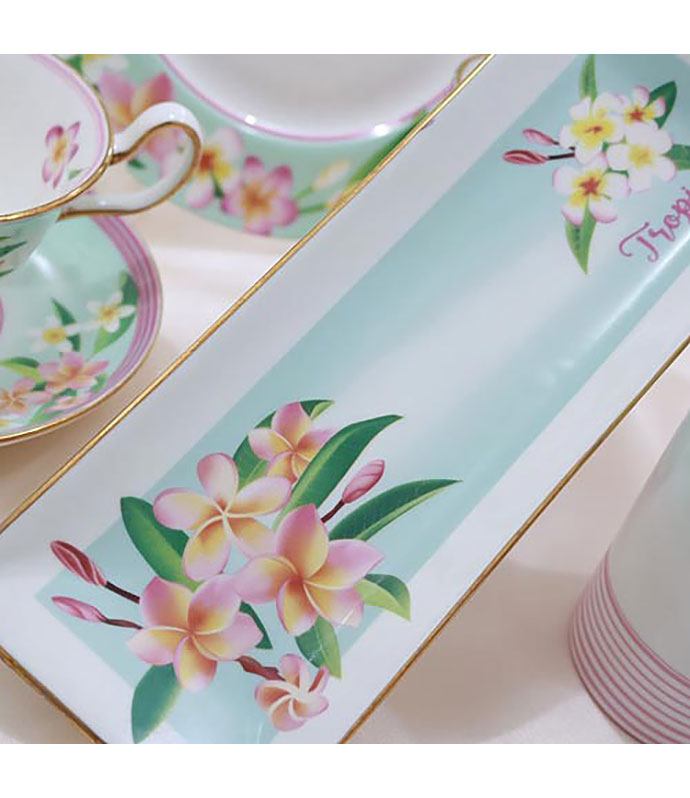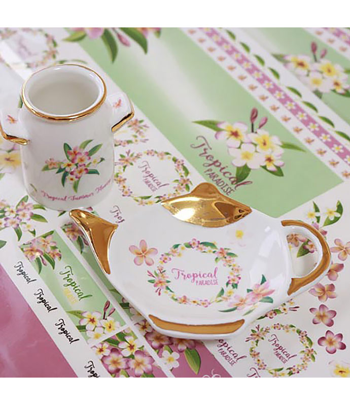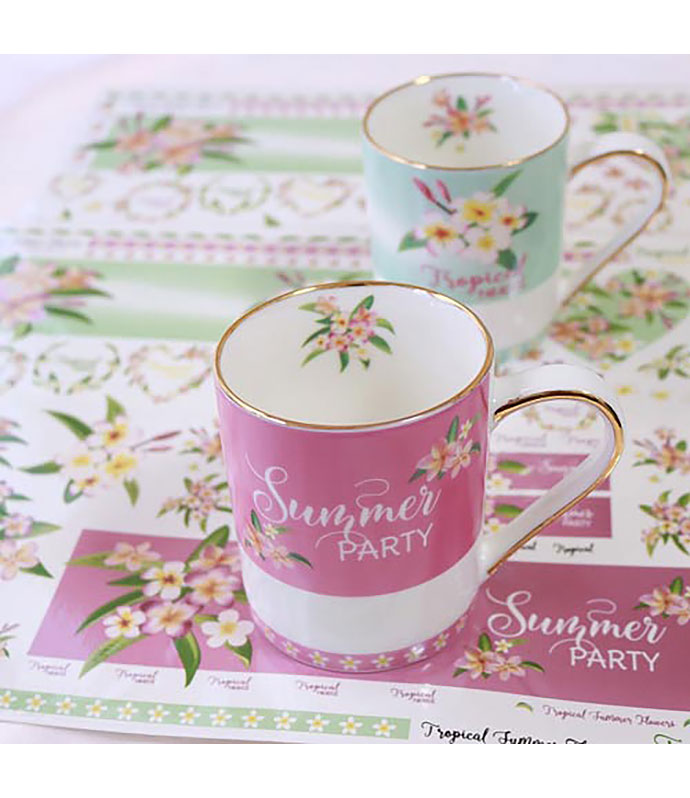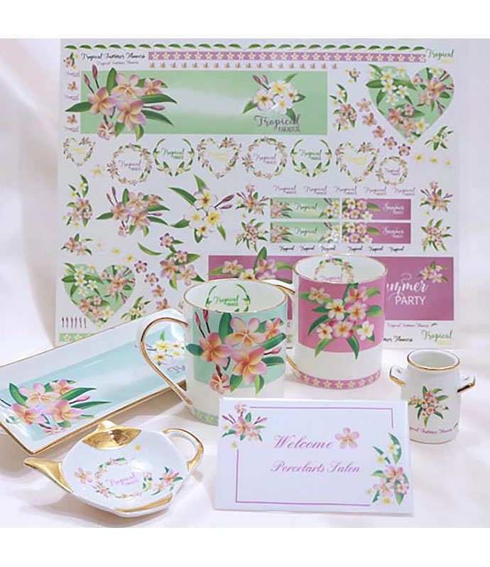 以下の①、②の転写紙は、カップ&ソーサー・マグカップ・ケーキ皿・箸置きなどの人気のアイテムを制作しやすいように設計されており、③の転写紙では、お好みに応じて変化をつける事が出来るように、英字・数字・フレームを中心に表現しました。