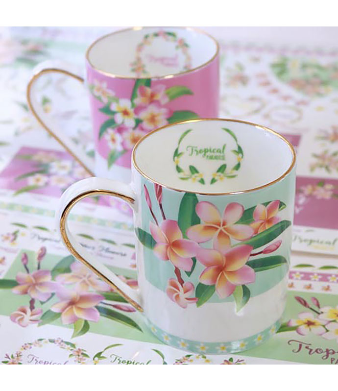 プルメリアを魅力的に表現するために背景色をパステルエメラルドのグラデーションにし、デザインしたものです。
